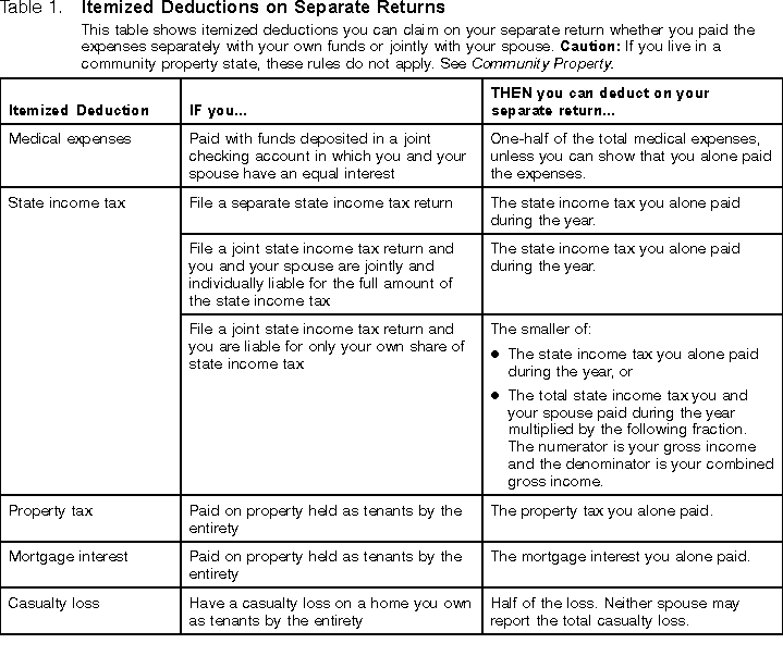 Separate ReturnsIf you and your spouse file separate returns, you should each report only your own income, exemptions, deductions, and credits on your individual return. You can file a separate return even if only one of you had income. For information on exemptions you can claim on your separate return, see Exemptions, later. Community or separate income. If you live in a community property state and file a separate return, your income may be separate income or community income for income tax purposes. For more information, see Community Income under Community Property, later. Separate liability. If you and your spouse file separately, you each are responsible only for the tax due on your own return. Itemized deductions. If you and your spouse file separate returns and one of you itemizes deductions, the other spouse will not qualify for the standard deduction and should also itemize deductions. Dividing itemized deductions. You may be able to claim itemized deductions on a separate return for certain expenses that you paid separately or jointly with your spouse. See Table 1. Table 1. Itemized Deductions on Separate ReturnsDeductions Separate returns may give you a higher tax. Some married couples file separate returns because each wants to be responsible only for his or her own tax. But in almost all instances, if you file separate returns, you will pay more combined federal tax than you would with a joint return. This is because the tax rate is higher for married persons filing separately. The following rules also apply if you file a separate return.
