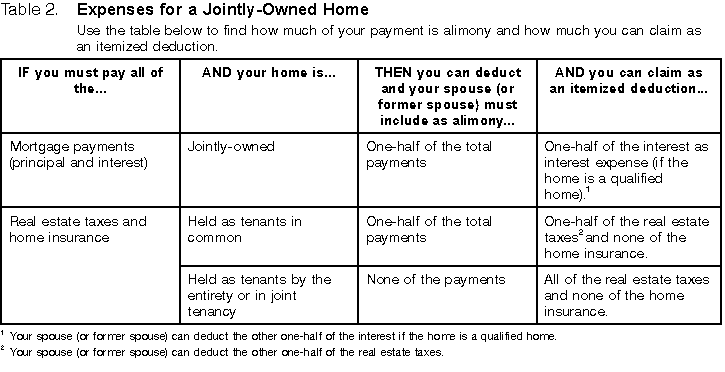 Example. Under your written separation agreement, your spouse lives rent-free in a home you own and you must pay the mortgage, real estate taxes, insurance, repairs, and utilities for the home. Because you own the home and the debts are yours, your payments for the mortgage, real estate taxes, insurance, and repairs are not alimony. Neither is the value of your spouse's use of the home. If they otherwise qualify, you can deduct the payments for utilities as alimony. Your spouse must report them as income. If you itemize deductions, you can deduct the real estate taxes and, if the home is a qualified home, you can also include the interest on the mortgage in figuring your deductible interest. Child support. To determine whether a payment is child support, see the separate discussions under Instruments Executed After 1984 or Instruments Executed Before 1985, later. Underpayment. If both alimony and child support payments are called for by your divorce or separation instrument, and you pay less than the total required, the payments apply first to child support and then to alimony. Example. Your divorce decree calls for you to pay your former spouse $200 a month as child support and $150 a month as alimony. If you pay the full amount of $4,200 during the year, you can deduct $1,800 as alimony and your former spouse must report $1,800 as alimony received. If you pay only $3,600 during the year, $2,400 is child support. You can deduct only $1,200 as alimony and your former spouse must report $1,200 as alimony received. Payments to a third party. Cash payments (including checks and money orders) to a third party on behalf of your spouse under the terms of your divorce or separation instrument may be alimony, if they otherwise qualify. These include payments for your spouse's medical expenses, housing costs (rent, utilities, etc.), taxes, tuition, etc. The payments are treated as received by your spouse and then paid to the third party. Example 1. Under your divorce decree, you must pay your former spouse's medical and dental expenses. If the payments otherwise qualify, you can deduct them as alimony on your return. Your former spouse must report them as alimony received and can include them in figuring deductible medical expenses. Example 2. Under your separation agreement, you must pay the real estate taxes, mortgage payments, and insurance premiums on a home owned by your spouse. If they otherwise qualify, you can deduct the payments as alimony on your return, and your spouse must report them as alimony received. If itemizing deductions, your spouse can deduct the real estate taxes and, if the home is a qualified home, also include the interest on the mortgage in figuring deductible interest. Life insurance premiums. Alimony includes premiums you must pay under your divorce or separation instrument for insurance on your life to the extent your spouse owns the policy. Payments for jointly-owned home. If your divorce or separation instrument states that you must pay expenses for a home owned by you and your spouse or former spouse, some of your payments may be alimony. See Table 2. Table 2. Expenses for a Jointly-Owned Home Instruments Executed After 1984The following rules for alimony apply to payments under divorce or separation instruments executed after 1984. Exception for instruments executed before 1985. There are two situations where the rules for instruments executed after 1984 apply to instruments executed before 1985.