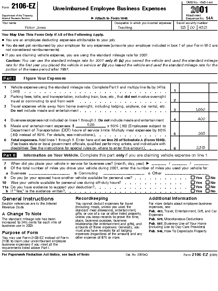 Because Victor's reimbursement was included in his income, he files Form 2106-EZ with his tax return. He shows his expenses for the seminar in Part I of the form. He enters $1,650 ($1,050 + $550 + $50) on line 3 to account for his lodging, airfare, and taxi fares. He enters $400 on line 4 for his tuition and books. On the line to the left of line 5, Victor enters $526 for meal expenses. He multiplies that amount by 50% and enters the result, $263, on line 5. On line 6, Victor totals the amounts from lines 3 through 5. He carries the total, $2,313, to line 20 of Schedule A (Form 1040). Since he does not claim any vehicle expenses, Victor leaves Part II blank. His filled-in form is shown on the next page.