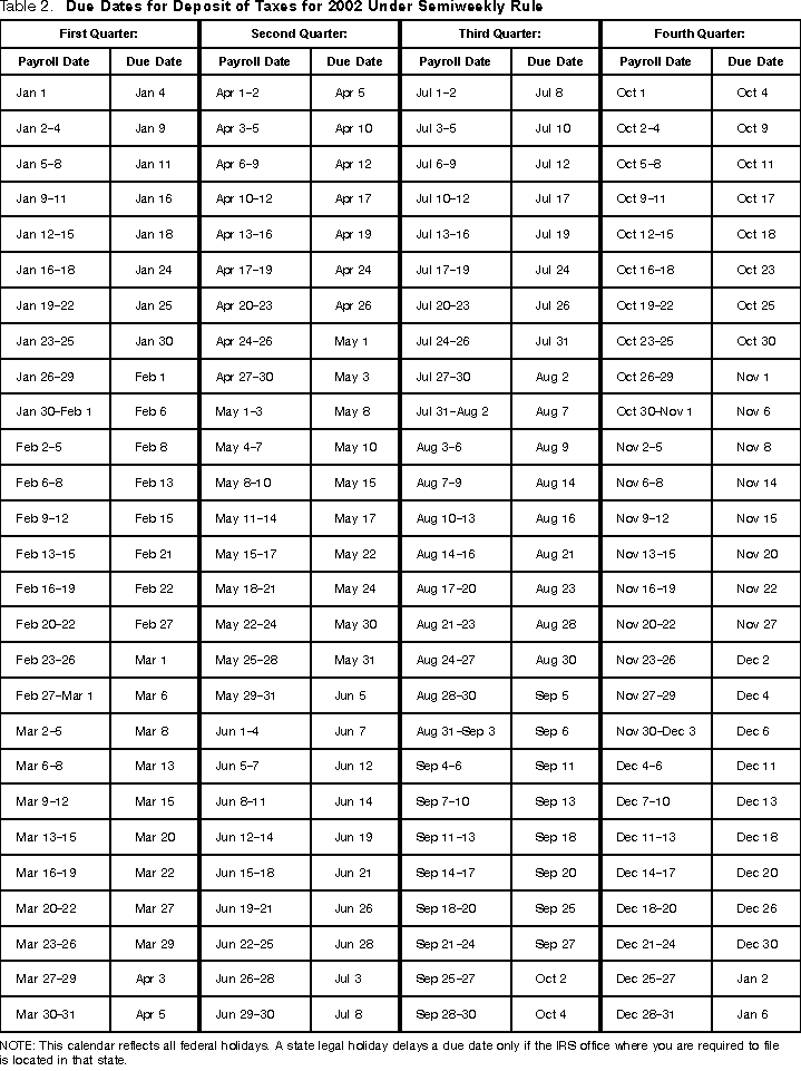Regular method taxes. These are taxes, other than alternative method taxes used for communication and air transportation taxes, reported on Form 720 for which deposits are required. First QuarterThe first quarter of a calendar year is made up of January, February, and March. January 10Communications and air transportation taxes under the alternative method. Deposit the tax included in amounts billed or tickets sold during the first 15 days of December. January 14Regular method taxes. Deposit the tax for the last 16 days of December. January 25Communications and air transportation taxes under the alternative method. Deposit the tax included in amounts billed or tickets sold during the last 16 days of December. January 29Regular method taxes. Deposit the tax for the first 15 days of January. January 31Form 720 taxes. File Form 720 for the fourth quarter of 2001. Wagering tax. File Form 730 and pay the tax on wagers accepted during December. Heavy highway vehicle use tax. File Form 2290 and pay the tax (or the first installment) for vehicles first used in December. February 12Communications and air transportation taxes under the alternative method. Deposit the tax included in amounts billed or tickets sold during the first 15 days of January. February 14Regular method taxes. Deposit the tax for the last 16 days of January. February 27Communications and air transportation taxes under the alternative method. Deposit the tax included in amounts billed or tickets sold during the last 16 days of January. February 28Wagering tax. File Form 730 and pay the tax on wagers accepted during January. Heavy highway vehicle use tax. File Form 2290 and pay the tax (or the first installment) for vehicles first used in January. March 1Regular method taxes. Deposit the tax for the first 15 days of February. March 12Communications and air transportation taxes under the alternative method. Deposit the tax included in amounts billed or tickets sold during the first 15 days of February. March 14Regular method taxes. Deposit the tax for the last 13 days of February. March 27Communications and air transportation tax under the alternative method. Deposit the tax included in amounts billed or tickets sold during the last 13 days of February. March 29Regular method taxes. Deposit the tax for the first 15 days of March. Second QuarterThe second quarter of a calendar year is made up of April, May, and June. April 1Wagering tax. File Form 730 and pay the tax on wagers accepted during February. Heavy highway vehicle use tax. File Form 2290 and pay the tax (or the first installment) for vehicles first used in February. Also, pay the installments for other vehicles, if applicable. April 10Communications and air transportation tax under the alternative method. Deposit the tax included in amounts billed or tickets sold during the first 15 days of March. April 12Regular method taxes. Deposit the tax for the last 16 days of March. April 25Communications and air transportation tax under the alternative method. Deposit the tax included in amounts billed or tickets sold during the last 16 days of March. April 29Regular method taxes. Deposit the tax for the first 15 days of April. April 30Form 720 taxes. File Form 720 for the first quarter of 2002. Wagering tax. File Form 730 and pay the tax on wagers accepted during March. Heavy highway vehicle use tax. File Form 2290 and pay the tax (or the first installment) for vehicles first used in March. May 10Communications and air transportation taxes under the alternative method. Deposit the tax included in amounts billed or tickets sold during the first 15 days of April. May 14Regular method taxes. Deposit the tax for the last 15 days of April. May 28Communications and air transportation taxes under the alternative method. Deposit the tax included in amounts billed or tickets sold during the last 15 days of April. May 29Regular method taxes. Deposit the tax for the first 15 days of May. May 31Wagering tax. File Form 730 and pay the tax on wagers accepted during April. Heavy highway vehicle use tax. File Form 2290 and pay the tax for vehicles first used in April. June 12Communications and air transportation taxes under the alternative method. Deposit the tax included in amounts billed or tickets sold during the first 15 days of May. June 14Regular method taxes. Deposit the tax for the last 16 days of May. June 26Communications and air transportation taxes under the alternative method. Deposit the tax included in amounts billed or tickets sold during the last 16 days of May. June 28Regular method taxes. Deposit the tax for the first 15 days of June. Third QuarterThe third quarter of a calendar year is made up of July, August, and September. July 1Wagering tax. File Form 730 and pay the tax on wagers accepted during May. Heavy highway vehicle use tax. File Form 2290 and pay the tax for vehicles first used in May. Also, pay the installments for other vehicles, if applicable. Floor stocks tax for ozone-depleting chemicals (IRS No. 20). Deposit the tax for January 1, 2002. Occupational excise taxes. File Form 11-C to register and pay the annual tax if you are in the business of taking wagers. July 10Communications and air transportation taxes under the alternative method. Deposit the tax included in amounts billed or tickets sold during the first 15 days of June. July 12Regular method taxes. Deposit the tax for the last 15 days of June. July 25Communications and air transportation taxes under the alternative method. Deposit the tax included in amounts billed or tickets sold during the last 15 days of June. July 29Regular method taxes. Deposit the tax for the first 15 days of July. July 31Form 720 taxes. File Form 720 for the second quarter of 2002. Wagering tax. File Form 730 and pay the tax on wagers accepted during June. Heavy highway vehicle use tax. File Form 2290 and pay the tax for vehicles first used in June. August 12Communications and air transportation taxes under the alternative met