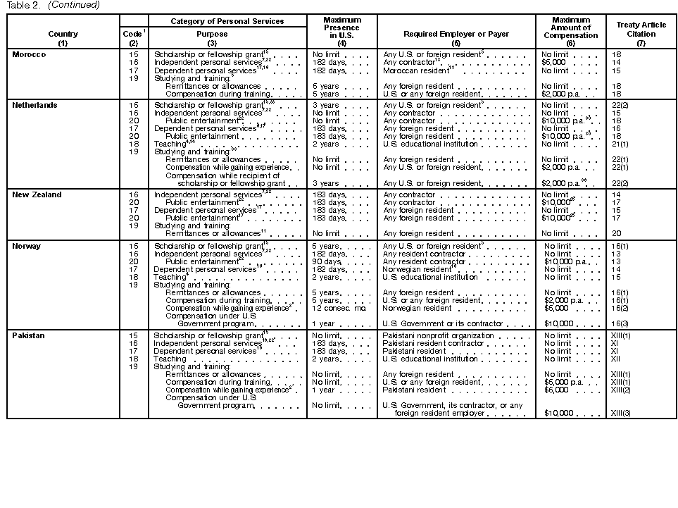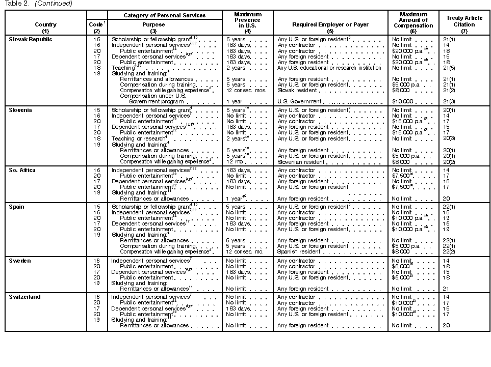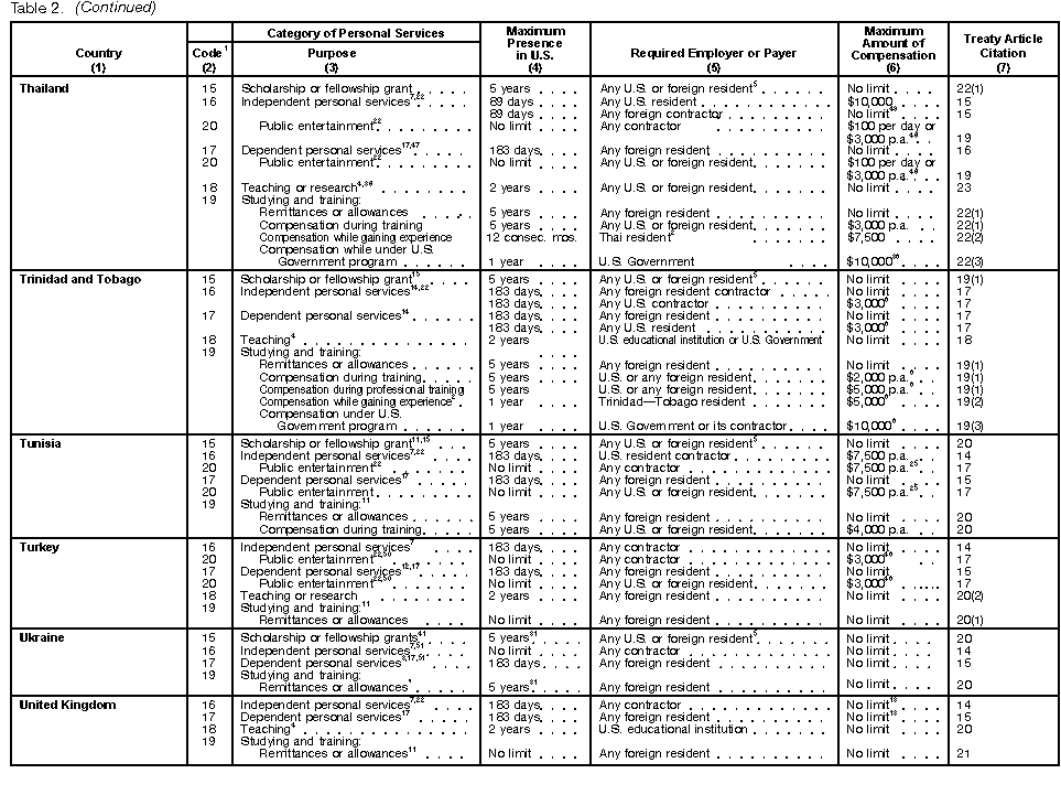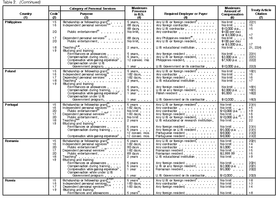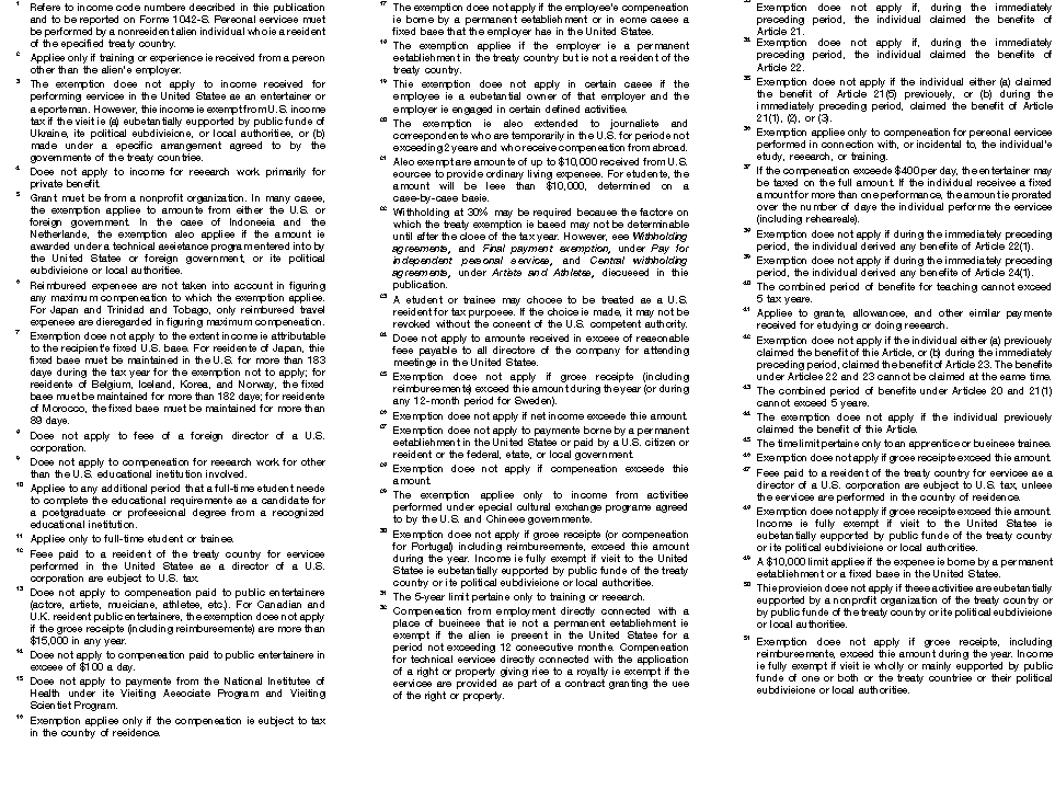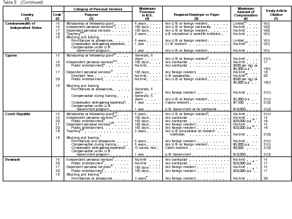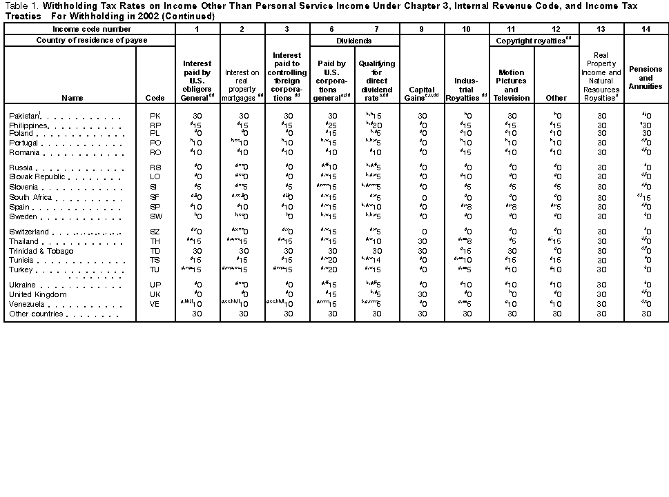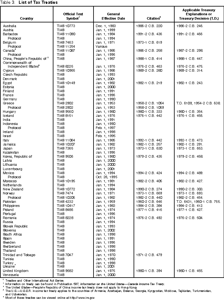 Tax Treaty TablesThe United States has income tax treaties (or conventions) with a number of foreign countries under which residents (sometimes limited to citizens) of those countries are taxed at a reduced rate or are exempt from U.S. income taxes on certain income received from within the United States. Three tables follow: Table 1 lists the withholding rates on income other than personal service income. Table 2 lists the different types of personal service income that are entitled to an exemption from, or reduction in, withholding. Table 3 shows where the full text of each treaty and protocol may be found in the Cumulative Bulletins if it has been published.