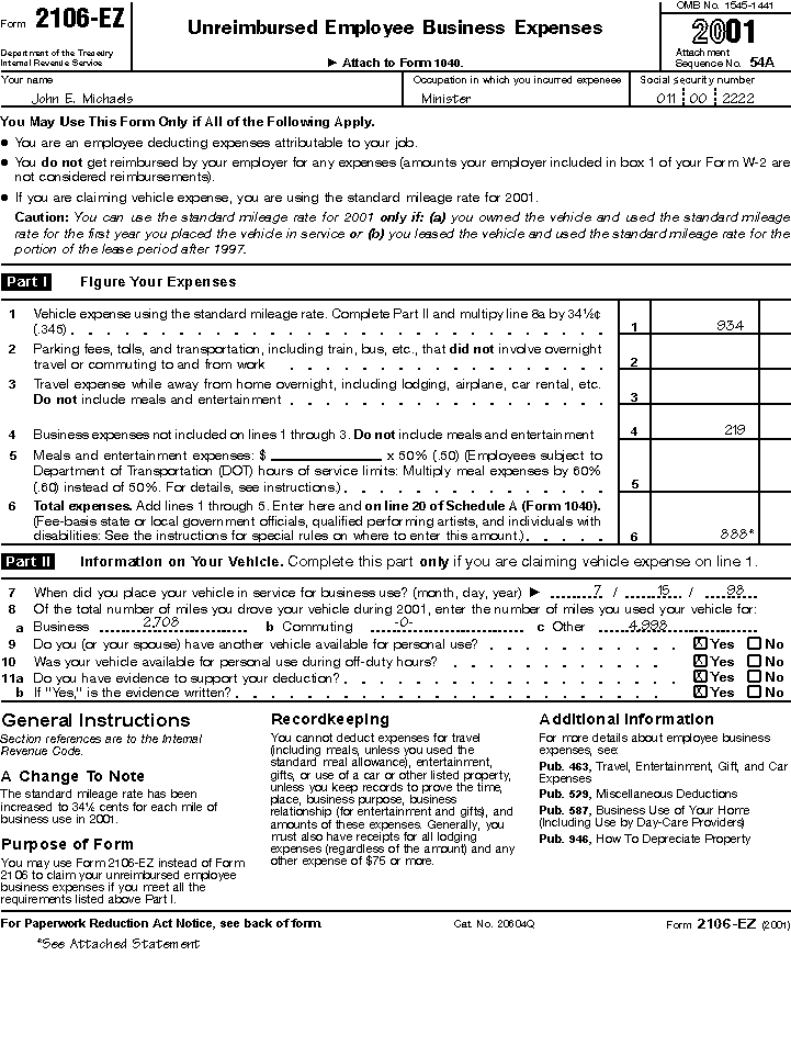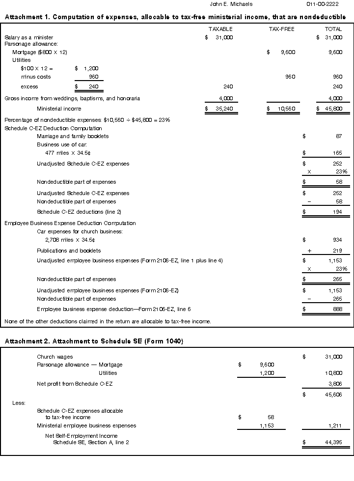 Comprehensive ExampleRev. John Michaels is the minister of the First United Church. He is married and has one child. The child is considered a qualifying child for the child tax credit. Mrs. Michaels is not employed outside the home. Rev. Michaels is a common-law employee of the church, and he has not applied for an exemption from SE tax. The church paid Rev. Michaels a salary of $31,000. In addition, as a self-employed person, he earned $4,000 during the year for weddings, baptisms, and honoraria. He made estimated tax payments during the year totaling $8,400. He taught a course at the local community college, for which he was paid $3,400. Rev. Michaels owns a home next to the church. He makes an $800 per month mortgage payment of principal and interest only. The church paid him $800 per month as his parsonage allowance (excluding utilities). The home's fair rental value is $900 per month. The utility bills for the year totaled $960. The church paid him $100 per month designated as an allowance for utility costs. The parts of Rev. and Mrs. Michaels' income tax return are explained in the order they are completed. They are illustrated in the order that the Rev. Michaels will assemble the return to send it to the IRS. Form W-2 From ChurchThe church completed its Form W-2 for Rev. Michaels as follows: Box 1. The church entered Rev. Michaels' $31,000 salary. Box 2. The church left this box blank because Rev. Michaels did not request federal income tax withholding. Boxes 3 through 6. Because Rev. Michaels is considered a self-employed person for purposes of social security and Medicare tax withholding, the church left these boxes blank. Box 14. The church entered Rev. Michaels' total parsonage and utilities allowance for the year and identified them. Form W-2 From CollegeThe community college gave Rev. Michaels a Form W-2 that showed the following: Box 1. The college entered Rev. Michaels' $3,400 salary. Box 2. The college withheld $272 in federal income tax on Rev. Michaels' behalf. Boxes 3 and 5. As an employee of the college, Rev. Michaels is subject to social security and Medicare withholding on his full salary from the college. Box 4. The college withheld $210.80 in social security taxes. Box 6. The college withheld $49.30 in Medicare taxes. Schedule C-EZ (Form 1040)Some of Rev. Michaels' entries on Schedule C-EZ are explained here. Line 1. Rev. Michaels reports the $4,000 from weddings, baptisms, and honoraria. Line 2. Rev. Michaels reports his expenses related to the line 1 amount. The total consisted of $87 for marriage and family booklets and $165 for 477 miles of business use of his car, mainly in connection with honoraria. Rev. Michaels used the standard mileage rate to figure his car expense. He multiplied the standard mileage rate of 34.5 cents by 477 miles to get $165. These expenses total $252 ($165 + $87). However, he cannot deduct the part of his expenses allocable to his tax-free parsonage allowance. He attaches the required statement, Attachment 1 (shown later) to his return showing that 23% (or $58) of his business expenses are not deductible because they are allocable to that allowance. He subtracts the $58 from the $252 and enters the $194 difference on line 2. Line 3. He enters his net profit of $3,806 both on line 3 and on Form 1040, line 12. Lines 4 through 8b. Rev. Michaels fills out these lines to report information about his car. Form 2106-EZRev. Michaels fills out Form 2106-EZ to report the unreimbursed business expenses he had as a common-law employee of First United Church. Line 1. Before completing line 1, Rev. Michaels fills out Part II because he used his car for church business. His records show that he drove 2,708 business miles, which he reports in Part II. On line 1, he multiplies 2,708 miles by the mileage rate of 34.5 cents for the year. The result is $934. Line 4. He enters $219 for his professional publications and booklets. Line 6. Before entering the total expenses on line 6, Rev. Michaels must reduce them by the amount allocable to his tax-free parsonage allowance. On the required Attachment 1 (shown later), he shows that 23% (or $265) of his employee business expenses are not deductible because they are allocable to the tax-free parsonage allowance. He subtracts $265 from $1,153 and enters the result, $888, on line 6. He also enters $888 on line 20 of Schedule A (Form 1040). Schedule A (Form 1040)Rev. Michaels fills out Schedule A as explained here. Line 6. Rev. Michaels deducts $1,750 in real estate taxes. Line 10. He deducts $6,810 of home mortgage interest. Line 15. Rev. and Mrs. Michaels contributed $4,800 in cash during the year to various qualifying charities. Each individual contribution was less than $250. Line 20. Rev. Michaels enters his unreimbursed employee business expenses from Form 2106-EZ, line 6. Lines 24, 25, and 26. He can deduct only the part of his employee business expenses that exceeds 2% of his adjusted gross income. He fills out these lines to figure the amount he can deduct. Line 28. The total of all the Michaels' itemized deductions is $13,542, which they enter on line 28 and on Form 1040, line 36. Schedule SE (Form 1040)After Rev. Michaels prepares Schedule C-EZ and Form 2106-EZ, he fills out Schedule SE. He reads the chart on page 1 of the schedule which tells him he can use Section A--Short Schedule SE to figure his self-employment tax. Rev. Michaels is a minister, so his salary from the church is not considered church employee income. Thus, he does not have to use Section B--Long Schedule SE. He fills out the following lines in Section A. Line 2. Rev. Michaels attaches a statement (see Attachment 2, later) that explains how he figures the amount ($44,395) to enter. Line 4. He multiplies $44,395 by .9235 to get his net earnings from self-employment ($40,999). Line 5. Because the amount on line 4 is less than $80,400, Rev. Michaels multiplies the amount on line 4 ($40,999) by .153 to get his self-employment tax of $6,