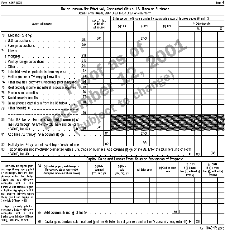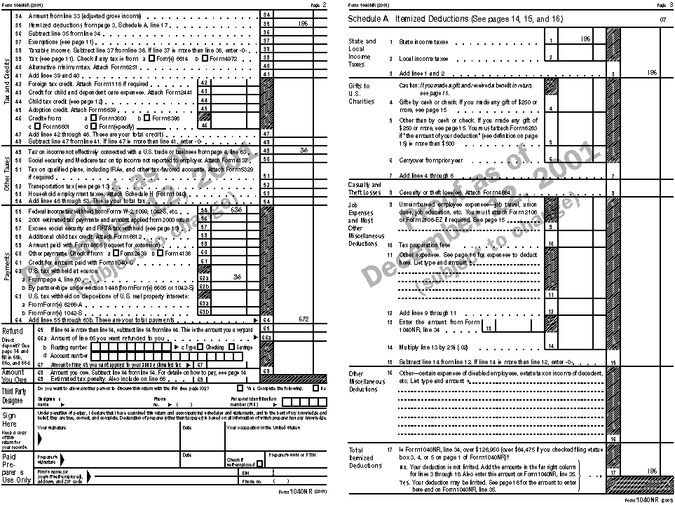 Before Sam left the United States in May, he filed Form 1040-C (see chapter 11). He owed no tax when he left the United States. Form 1040NRSam completes Form 1040NR as follows. Pages 1, 2, and 3. Sam prints his name, address, and social security number on page 1 of Form 1040NR. He prints "Dual-Status Statement" across the top of the form. On line 8, Sam enters his salary while a nonresident. He enters the state income tax withheld from his salary on line 35 (carried from page 3, line 17, Schedule A) and the federal income tax withheld ($536) from his salary on line 55. He also carries these amounts to Form 1040 (discussed later). Page 4. Sam also reports the not effectively connected U.S. income received while he was a nonresident alien. He reports the April and July dividends from the Major Product Co. in column (c) of line 70a, page 4. He figures the tax on his dividend income on lines 82 and 83 and carries it forward to page 2, line 49 on Form 1040NR. (The rate of tax on this income is limited to 15% by Article 10 of the U.S.-U.K. income tax treaty. Treaty rates vary from country to country, so be sure to check the provisions in the treaty you are claiming.) Sam also reports $36, the amount of tax withheld at source by the Major Product Co. in column (a) of line 70a, Form 1040NR, and carries it forward to page 2, line 62a. Later he will report the amount on Form 1040. Page 5. Sam is not required to report the interest credited to his account by the U.S. Bank during the period he was a nonresident alien. Interest on deposits with U.S. banks that is not effectively connected with a U.S. trade or business generally is treated as income from sources in the United States but is not taxable to a nonresident alien. He checks the "Yes" box on page 5, item L, of Form 1040NR, and explains why this income is not included on his return. The interest income received from the U.K. Bank while Sam was a nonresident alien is foreign source income and not taxable on his U.S. return. Sam completes all applicable items on page 5 of Form 1040NR. This provides the dates of arrival and departure, types of visas, and information concerning tax treaty benefits that he has claimed. Form 1040Sam completes Form 1040 as follows. Page 1. Sam prints his name, social security number, and address on page 1 of Form 1040. He checks "Yes" for the Presidential Election Campaign Fund and "Single" under filing status. He also checks the exemption block for himself and prints "Dual-Status Return" across the top of the form. Sam reports on line 7, Form 1040, all wages received during the period he was a resident of the United States ($21,800) and the wages received during the period he was a nonresident alien ($6,500) that was effectively connected with his U.S. trade or business. This income is taxed at the graduated rates. Sam reports on Form 1040 the interest income credited to his account by the U.S. Bank and the U.K. Bank in September and December, while he was a U.S. resident. If any of the interest income received while he was a nonresident alien was effectively connected with his U.S. trade or business, he would also report these amounts on Form 1040. If he had paid foreign income tax on the interest income received from the U.K. Bank, he would claim a foreign tax credit. The dividend income includes only the October dividend, which was received while Sam was a U.S. resident. The dividend income received during his period of nonresidence was not effectively connected with his U.S. trade or business and, therefore, not taxed at the graduated rates. Sam completes Form 3903 (not illustrated) to figure his moving expense deduction and reports the total on line 26, Form 1040. Schedule A (Form 1040). Sam cannot claim the standard deduction because he has a dual-status tax year. He reports his itemized deductions on Schedule A (Form 1040). The only itemized deduction he had while he was a nonresident alien was the state income tax withheld from his pay. For information purposes, he lists this amount on line 1, Schedule A, Form 1040NR, in addition to including it on Schedule A, Form 1040. Sam totals his itemized deductions on line 28, Schedule A (Form 1040). Page 2. Sam reports the amount from line 28 of Schedule A (Form 1040) on line 36, Form 1040. Sam enters $2,900 for one personal exemption on line 38, Form 1040. He subtracts the amount on line 38 from the amount on line 37 to figure his taxable income, line 39. Sam is now ready to figure the tax on his income taxed at the graduated rates. He uses the column in the Tax Table for single individuals. To this tax ($2,501), he must add the tax on the income not effectively connected ($36), the income taxed at the 30% or lower treaty rate. Since there is no line on Form 1040 for this computation, he reports the two amounts in the margin in the Tax and Credits area of Form 1040. Sam figures his rate reduction credit using the worksheet in the Form 1040 instructions. He enters this credit on line 47. Sam reports the total amount of tax withheld ($2,700) from his wages on line 59, Form 1040. He includes in this amount the tax withheld at source ($36 from line 62a, Form 1040NR) on dividends paid to him while he was a nonresident alien. He also writes a brief explanation. Sam compares the total tax on line 58, Form 1040, to the total payments on line 66, to see if he has overpaid his tax or if he owes an additional amount. Since the amount of tax withheld and the amount of tax paid at source are more than his total tax, he has overpaid his tax. He subtracts the amount on line 58 from the amount on line 66 to figure his refund. Sam checks to be sure that he has completed all parts of Form 1040 that apply to him. He also checks to see if he has completed the necessary parts of the Form 1040NR that he is attaching as a statement. He then signs and dates the return and enters his occupation.