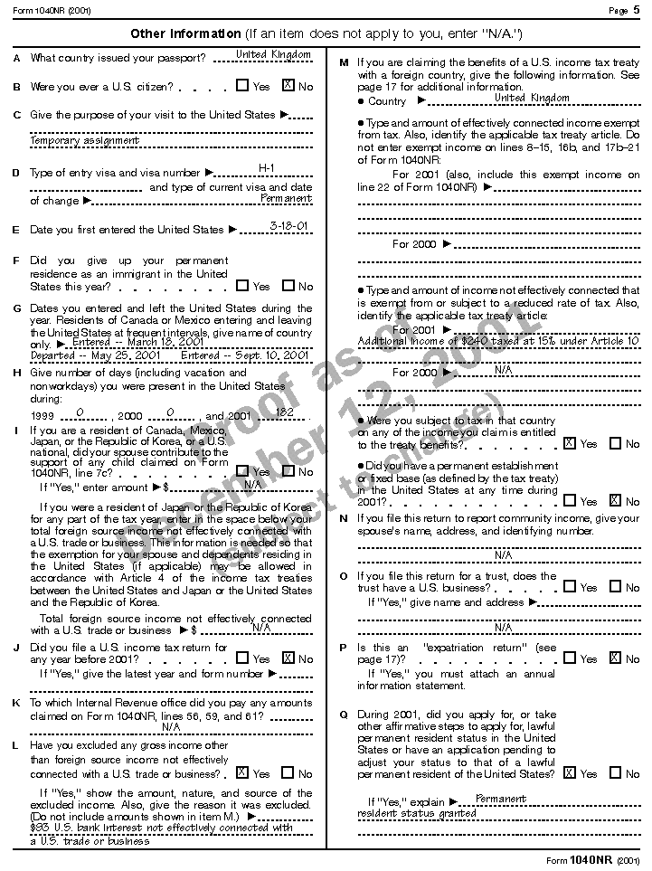 Illustration of Dual-Status ReturnSam R. Brown is single and a subject of the United Kingdom (U.K.). He temporarily entered the United States with an H-1 visa to develop a new product line for the Major Product Co. He arrived in the United States March 18, 2001, and left May 25, 2001, returning to his home in England. The Major Product Co. later offered Sam a permanent job, and he returned to the United States with a permanent visa on September 10, 2001. During Sam's temporary assignment in the United States, the Major Product Co. paid him $6,500. He accounted to his employer for his expenses for travel, meals, and lodging while on temporary assignment, and was reimbursed for his expenses. This amount was not included on his wage statement, Form W-2, given to him when he left the United States. After Sam became permanently employed, his wages for the rest of the year were $21,800, including reimbursement of his moving expenses. He received a separate Form W-2 for this period. His other income received in 2001 was: Interest income paid by the U.S. Bank (not effectively connected):