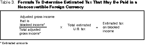 You should prepare at least two copies of this statement. Attach one copy to your Form 1040 and keep the other copy for identification purposes when you make a tax deposit of nonconvertible foreign currency. Figuring actual tax. When you prepare your income tax return, you may owe tax or the entire liability may have been satisfied with your estimated tax payments. If you owe tax, figure the part due to (and payable in) the nonconvertible foreign currency by using the formula in Table 3.