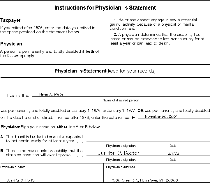 His credit is $225. He enters $225 on line 28 of Form 1040A. The Schedule 3 for James Davis is not shown. Example 2. William White is 53. His wife Helen is 49. William had a stroke 3 years ago and retired on permanent and total disability. He is still permanently and totally disabled because of the stroke. In November of last year, Helen was injured in an accident at work and retired on permanent and total disability. William received nontaxable social security disability benefits of $3,000 during the year and a taxable disability pension of $6,000. Helen earned $9,200 from her job and received a taxable disability pension of $1,000. Their joint return on Form 1040 shows adjusted gross income of $16,200 ($6,000 + $9,200 + $1,000). Helen got her doctor to complete the physician's statement in the instructions for Schedule R. Helen is not required to include the statement with their return for the year, but she must keep it for her records. William got a physician's statement for the year he had the stroke. His doctor had signed on line B of that physician's statement to certify that William was permanently and totally disabled. William has kept the physician's statement with his records. He checks the box in Part II of Schedule R and writes his first name in the space above line 2. William and Helen use Schedule R to figure their $135 credit for the elderly or the disabled. They attach Schedule R to the joint return and enter $135 on line 45 of Form 1040. See their filled-in Schedule R and Helen's filled-in physician's statement, later. Example 3. Jerry Ash is 68 years old and single, and files Form 1040A. He received the following income for the year:
