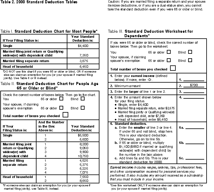 Standard deduction for earlier years. To determine if amounts recovered in 2001 must be included in your income, you must know the standard deduction for your filing status for the year the deduction was claimed. The standard deduction tables for 2000, 1999, and 1998 are shown in Tables 2, 3, and 4. If you need the standard deduction amounts for years before 1998, see the copy of your return for that year. Example. You filed a joint return for 2000 with a taxable income of $25,000. Your itemized deductions were $8,700. The standard deduction that you could have claimed was $7,350. In 2001, you recovered $2,400 of your 2000 itemized deductions. None of the recoveries were more than the actual deductions for 2000. Include $1,350 of the recoveries in your 2001 income. This is the smaller of your recoveries ($2,400) or the amount by which your itemized deductions were more than the standard deduction ($8,700 - $7,350 = $1,350). Negative taxable income. If your taxable income was a negative amount, reduce the recovery you must otherwise include in your income by the negative amount. Example. The facts are the same as in the previous example except you had a negative taxable income of $200 in 2000. You must include $1,150 in your 2001 income, rather than $1,350. Recovery limited to deduction. You do not include in your income any amount of your recovery that is more than the amount you deducted in the earlier year. The amount you include in your income is limited to the smaller of: