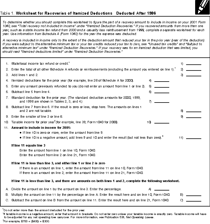 Example. You paid 2000 estimated state income tax of $4,000 in four equal payments. You made your fourth payment in January 2001. You had no state income tax withheld during 2000. In 2001, you received a $400 tax refund based on your 2000 state income tax return. You claimed itemized deductions each year on your federal income tax return. You must allocate the $400 refund between 2000 and 2001, the years in which you paid the tax on which the refund is based. Since you paid 75% ($3,000 ÷ $4,000) of the estimated tax in 2000, 75% of the $400 refund, or $300, is for amounts you paid in 2000 and is a recovery item. If all of the $300 is a taxable recovery item, you will include $300 on line 10, Form 1040, for 2001, and attach a copy of your computation showing why that amount is less than the amount shown on the Form 1099-G you received from the state. The balance ($100) of the $400 refund is for your January 2001 estimated tax payment. When you figure your deduction for state and local income taxes paid during 2001, you will reduce the $1,000 paid in January by $100. Your deduction for state and local income taxes paid during 2001 will include the January net amount of $900 ($1,000 - $100), plus any estimated state income taxes paid in 2001 for 2001, and any state income tax withheld during 2001. Deductions not itemized. If you did not itemize deductions for the year for which you received the recovery of an expense that was deductible only if you itemized, do not include any of the recovery amount in your income. Example. You filed your 2000 federal income tax return on Form 1040A. In 2001 you received a refund of your 2000 state income tax. Do not report any of the refund as income because you did not itemize deductions for 2000. Itemized Deduction RecoveriesThe following discussion explains how to determine the amount to include in your income from a recovery of an amount deducted in an earlier year as an itemized deduction. However, you generally do not need to use this discussion if the recovery is for state or local income taxes paid in 2000. Instead, use the worksheet in the 2001 Form 1040 instructions for line 10 to figure the amount (if any) to include in your income. You cannot use the Form 1040 worksheet and must use this discussion if any of the following statements is true.