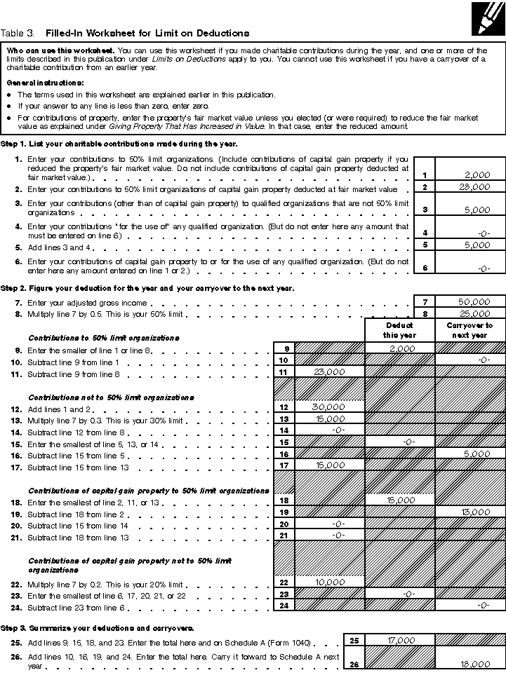 If more than one of the limits described above limit your deduction for charitable contributions, you may want to use the worksheet in Table 4 on page 16 to figure your deduction and your carryover.