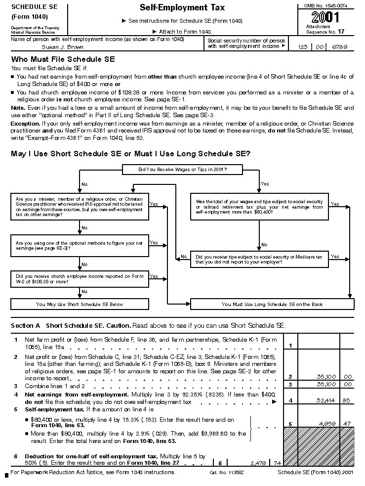 Filled-In Form ExamplesThe following examples illustrate the use of the short and long forms of Schedule SE (Form 1040). Short Schedule SE ExampleThe following example shows how Susan J. Brown fills out Section A-Short Schedule SE. BackgroundSusan J. Brown is the sole proprietor of a dress shop, "Milady Fashions." She received no wages and she does not own any other business. Her husband has no interest in her business. Her Schedule C (Form 1040) shows a net profit of $35,100 in 2001. Completing Schedule SESusan's completed Schedule SE with Short Schedule SE filled out is shown later. The following table describes how Susan completes each line on her schedule.