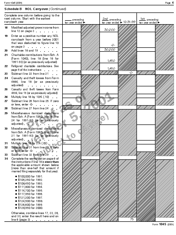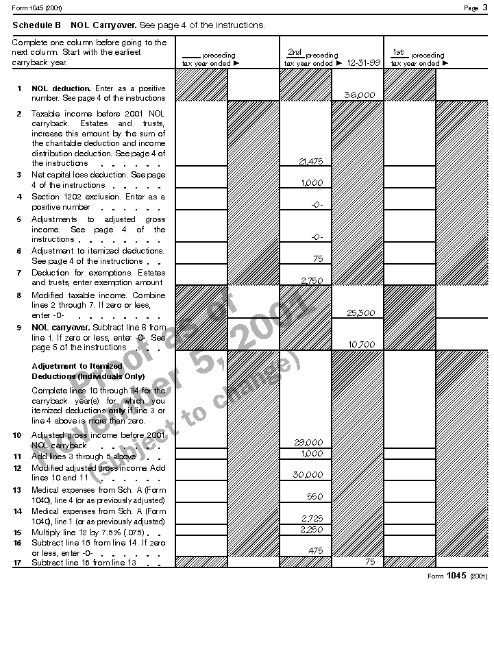 Your taxable income as modified cannot be less than zero. Schedule B (Form 1045). You can use Schedule B (Form 1045) to figure your modified taxable income for carryback years and your carryover from each of those years. Do not use Schedule B for a carryforward year. If your 2001 return includes an NOL deduction from an NOL year before 2001 that reduced your taxable income to zero (to less than zero, if an estate or trust), see NOL Carryover From 2001 to 2002, later. Illustrated Schedule B (Form 1045)The following example illustrates how to figure an NOL carryover from a carryback year. It includes a filled-in Schedule B (Form 1045). Example. Ida Brown runs a small clothing shop. In 2001, she has an NOL of $36,000 that she chooses to carry back to 1999. She has no other carrybacks or carryovers to 1999. Ida's adjusted gross income in 1999 was $29,000, consisting of her salary of $30,000 minus a $1,000 capital loss deduction. She is single and claimed only one personal exemption of $2,750. During that year, she gave $1,450 in charitable contributions. Her medical expenses were $2,725. She also deducted $1,650 in taxes and $1,125 in home mortgage interest. Her deduction for charitable contributions was not limited because her contributions, $1,450, were less than 50% of her adjusted gross income. The deduction for medical expenses was limited to expenses over 7.5% of adjusted gross income (.075 × $29,000 = $2,175; $2,725 - $2,175 = $550). The deductions for taxes and home mortgage interest were not subject to any limits. She was able to claim $4,775 ($1,450 + $550 + $1,650 + $1,125) in itemized deductions for 1999. She had no other deductions in 1999. Her taxable income for the year was $21,475. Ida's $36,000 carryback will reduce her 1999 taxable income to zero. She completes the column labeled 2nd preceding tax year ended