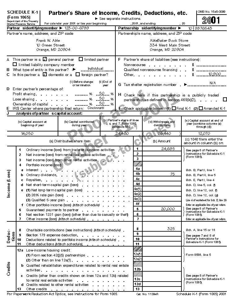 Form 1065 ExampleThis filled-in Form 1065 is for the AbleBaker Book Store, a partnership composed of Frank Able and Susan Baker. The partnership uses an accrual method of accounting and a calendar year for reporting income and loss. Frank works full time in the business, while Susan works approximately 25% of her time in it. Both partners are general partners. The partnership agreement states that Frank will receive a yearly guaranteed payment of $20,000 and Susan will receive $5,000. Any profit or loss will be shared equally by the partners. The partners are personally liable for all partnership liabilities. Both partners materially participate in the operation of the business. In addition to receiving income and paying expenses in its partnership operations, AbleBaker made a $650 cash charitable contribution, received $150 from dividends, and received $50 tax-exempt interest from municipal bonds. Frank completes the partnership's Form 1065 as explained next. Page 1The IRS sent Frank a postcard with the partnership's preaddressed label, asking if he needed a Form 1065 package. He returned the postcard and the IRS sent him the package. When Frank completes the return, he places the partnership's label in the address area on page 1. Frank supplies all the information requested at the top of the page. IncomeThe partnership's ordinary income from the trade or business activity is shown on lines 1a through 8. Line 1. Gross sales of $409,465 are entered on line 1a. Returns and allowances of $3,365 are entered on line 1b, resulting in net sales of $406,100, entered on line 1c. Line 2. Cost of goods sold, $267,641, from Schedule A, line 8, is entered here. Line 3. Gross profit of $138,459 is shown on this line. Line 7. Interest income on accounts receivable, $559, is entered on this line. The schedule that must be attached for this line is not shown. Line 8. Total income, $139,018 (lines 3 through 7), is shown here. DeductionsThe partnership's allowable deductions are shown on lines 9 through 21. Line 9. All salaries and wages are included here except guaranteed payments to partners (shown on line 10). Frank enters the $29,350 wages paid to the partnership's employees. The partnership had no employment credits to reduce that amount. Line 10. Guaranteed payments of $25,000 to partners Frank ($20,000) and Susan ($5,000) are entered here. Line 11. Repairs of $1,125 made to partnership equipment are entered on this line. Line 12. During the year, $250 owed to the partnership was determined to be a wholly worthless business bad debt. The $250 is shown on this line. (If this had been a nonbusiness bad debt, it would have been reported in Part I of Schedule D (Form 1065) and included separately on Schedules K and K-1, line 7, as a stated short-term capital loss.) Line 13. Rent paid for the business premises, $20,000, is listed on this line. Line 14. Deductible taxes of $3,295 are entered on this line. Line 15. Interest paid to suppliers during the year totaled $1,451. This is business interest, so it is entered here. Lines 16a and 16c. Depreciation of $1,174 claimed on assets used in the partnership's business is entered on these lines. (Line 16b is left blank because there is no depreciation listed elsewhere on the return.) Frank does not need to attach Form 4562 because the partnership did not place property in service during 2001 or depreciate or claim a deduction for a car or other listed property. Line 20. Other allowable deductions of $8,003 not listed elsewhere on the return and for which a separate line is not provided on page 1 are included on this line. Frank attaches a schedule that lists each deduction and the amount included on line 20. This schedule is not shown. Line 21. The total of all deductions, $89,648 (lines 9 through 20), is entered on this line. Ordinary Income (Loss)Line 22. The amount on line 21 is subtracted from the amount on line 8. The result, $49,370, is entered here and on line 1 of Schedule K. The amount allocated to each partner is listed on line 1 of Schedule K-1. SignaturesFrank signs the return as a general partner. The AbleBaker Book Store did not have a paid preparer. Page 2 Schedule ASchedule A shows the computation of cost of goods sold. Beginning inventory, $18,125, is entered on line 1 and net purchases, $268,741, are entered on line 2. The total, $286,866, is entered on line 6. Ending inventory, $19,225 (entered on line 7), is subtracted from line 6 to arrive at cost of goods sold, $267,641 (entered on line 8 and on page 1, line 2). Frank answers all applicable questions for item 9. Schedule BSchedule B contains 12 questions about the partnership. Frank answers question 1 by marking the "Domestic general partnership" box. He answers questions 2 through 11 by marking the "No" boxes. He answers question 12 by entering -0- on this line. Question 5 asks if the partnership meets all the requirements listed in items 5a, b, and c. Because the partnership's total receipts were not less than $250,000, all three of these requirements are not met. Frank must complete Schedules L, M-1, M-2, and item F on page 1 of Form 1065 and item J on Schedule K-1. Pages 3 - 4 Schedule KOn Schedule K, Frank lists the total of both partners' shares of income, deductions, credits, etc. Each partner's distributive share of income, deductions, credits, etc., is reported on Schedule K-1. The line items for Schedule K are discussed in combination with the Schedule K-1 line items, later. Analysis of Net Income (Loss)An analysis must be made of the distributive items on Schedule K. This analysis is based on the type of partner. Since the AbleBaker Book Store has two individual partners, both of whom are "active" general partners, the total on line 1, $73,870, is entered on line 2a, column ii. Page 4 Schedules L, M-1, and M-2Partnerships do not have to complete Schedules L, M-1, or M-2 if all the tests listed under question 5 of Schedule B are met and question 5 is marked "Yes." The AbleBaker 