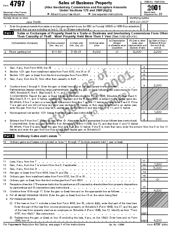 ExampleJane Smith is single. At the beginning of 2001, she owned and operated Jane's Dress Shop at 25 Main Street, Smalltown, Virginia. On March 16, she traded the land and building where she operated her dress shop for other land and a building around the corner at 97 Oak Street. She then opened the J. Smith Hardware Store. Jane also sold all the equipment she had used in her dress shop, as well as a vacant lot across the street from the shop used for customer parking. She reports these transactions as shown in the filled-in Form 4797 and Form 8824 at the end of this chapter. Form 4797Jane sold the equipment she used in her dress shop for $3,000. She originally paid $6,000 for it on January 20, 1986, and had fully depreciated it. She realized a gain of $3,000. Because the gain was less than the $6,000 depreciation taken, all her gain is ordinary income from depreciation. This amount is reported in Part III of Form 4797 and entered in Part II on line 13. The adjusted basis of the vacant lot (acquired in 1980) was $6,000 and its sales price was $8,000. Jane reports her $2,000 gain from the sale in Part I of Form 4797. Jane had a nonrecaptured net section 1231 loss of $1,200. She shows this loss in Part I on line 8. Since the net section 1231 gain of $2,000 is more than the nonrecaptured loss, that gain is treated as ordinary gain only up to the loss. Therefore, the loss of $1,200 on line 8 is entered as an ordinary gain in Part II of Form 4797 on line 12. The loss is also subtracted from the $2,000 gain on line 7. The $800 balance is entered on line 9. Form 8824Because Jane entered into a like-kind exchange by trading her business real property for other business real property, she must report the transaction on Form 8824 and attach the form to her tax return. On lines 16 and 17 of Form 8824, Jane enters the fair market value of her new property, $120,000, consisting of $95,000 for the building and $25,000 for the land. On line 18 she enters the adjusted basis of the old property, $100,000, consisting of $36,919 for the building and $63,081 for the land. Her realized gain on line 19 is $20,000. Under the like-kind exchange rules, this gain is not recognized. Jane enters "-0-" on line 20. However, because there is additional depreciation of $9,274 on the old building, Jane must determine whether any of her gain has to be recognized as ordinary income under the recapture rules. The old building has an FMV of $90,000. Had the transaction been a cash sale, Jane's realized gain on the building would have been $53,081 ($90,000 - $36,919). The additional depreciation is less than that amount, so her ordinary income due to the additional depreciation would have been $9,274. That amount is less than the $95,000 fair market value of the new building, and there is no ordinary income recognized on the exchange. The $9,274 ordinary income that does not have to be reported is carried over to the new building as additional depreciation. Jane enters "-0-" on line 21 of Form 8824 and line 16 of Form 4797. All of Jane's $20,000 gain is deferred (line 24). The basis of her new property (line 25) is $100,000, the same as the adjusted basis of her old property. Of that amount, $79,167 [($95,000 ÷ $120,000) × $100,000] is allocated to the building and $20,833 [($25,000 ÷ $120,000) × $100,000] is allocated to the land. SummaryThe entries in Part II, Form 4797, show an ordinary gain of $4,200, which is carried to line 14, Form 1040. The entries in Part I, Form 4797, result in a long-term capital gain of $800 from section 1231 transactions. This is carried to line 11, Schedule D (Form 1040), column (f). |