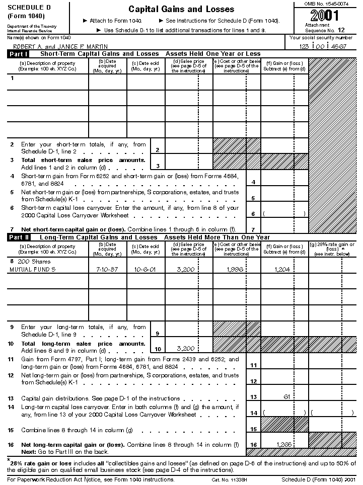 Comprehensive ExampleRobert and Janice Martin have the following four sources of investment income to report on their 2001 tax return. Their Schedules B and D (Form 1040) are shown later.