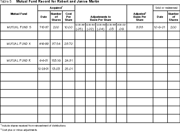 Mutual Fund Record. Robert and Janice keep track of all their basis adjustments on their Mutual Fund Record, shown later. They show the return of capital distributions and the undistributed capital gains from Mutual Fund S and the reinvested dividends from Mutual Fund R. They do not show the exempt-interest dividends from Mutual Fund X because those dividends do not reduce their basis in the shares. The Martins keep this record with their mutual fund documents, and they use it to report their 2001 sale of Mutual Fund S. Preparing the return. The Martins first use their two Forms 1099-DIV to figure the dividend income to report on Schedule B. They then use their Form 1099-B and their Mutual Fund Record to figure the gain from the sale of Mutual Fund S to report on Schedule D. Schedule B. On line 5, Robert and Janice list the $265 ordinary dividends from Mutual Fund R and the $237 ordinary dividends from Green Publishing Company (from box 1 of Forms 1099-DIV). They enter the total of $502 on line 6 and also on line 9 of Form 1040. Schedule D. Robert and Janice enter the $61 capital gain distribution from Mutual Fund R (from box 2a of Form 1099-DIV) on line 13, column (f). They do not make an entry in column (g) of line 13 because Mutual Fund R did not indicate that any of the capital gain distribution was a 28% rate gain distribution (box 2b of Form 1099-DIV). They enter the $30 qualified 5-year gain (from box 2c of Form 1099-DIV) on line 2 of the Qualified 5-Year Gain Worksheet in the instructions for Schedule D. They report the sale of their shares in Mutual Fund S on line 8 because they owned the shares for more than 1 year. They use the information from their Mutual Fund Record to complete columns (a), (b), and (e). After adjustment for their return of capital distributions and their undistributed capital gains, their basis is $1,996 ($9.98 per share). They use their Form 1099-B to complete columns (c) and (d). Their sales price in column (d) (the gross proceeds shown in box 2 of Form 1099-B) is $3,200 ($16 per share). They enter their gain of $1,204 in column (f). They do not make an entry in column (g) because the gain was not 28% rate gain. Because they owned their shares in mutual fund S for more than 5 years, the $1,204 gain is qualified 5-year gain. They enter $1,204 on line 1 of the Qualified 5-Year Gain Worksheet. They add the amounts on lines 1 and 2 of the worksheet and enter the total, $1,234, on line 5 and line 7 of the worksheet and on line 29 of Schedule D. Robert and Janice add the amounts on lines 8 and 13 of Schedule D and enter their net long-term capital gain of $1,265 on line 16. They also enter that amount on line 17. Because lines 16 and 17 are gains, they compute their tax using Part IV of Schedule D. (Part IV is shown, but not filled in, except line 29 for reporting qualified 5-year gain.)