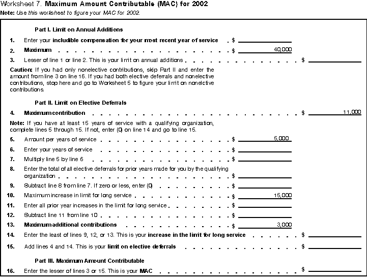 Worksheets 1 through 5, and 7 will help you figure MAC. Worksheet 6 will help your determine if you have excess contributions.