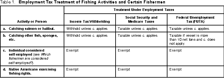 An independent contractor is someone who is self-employed. You do not generally have to withhold or pay any taxes on payments to an independent contractor. Individuals you employ to work on a boat that normally has an operating crew of fewer than 10 individuals may be considered self-employed. For more information, see Which fishermen are considered self-employed? under Form 1099-MISC, earlier. Table 1. See Table 1 for information on the employment tax treatment of fishing activities and certain fishermen. |