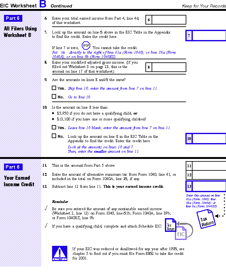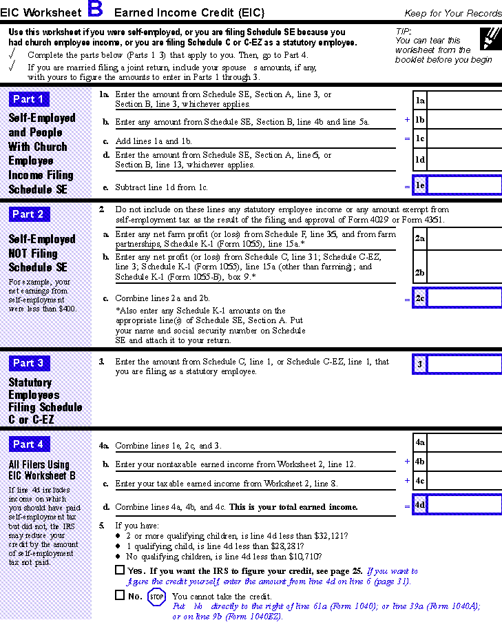 Schedule EICYou must complete and attach Schedule EIC to your tax return if you have a qualifying child and are claiming the EIC. Schedule EIC provides IRS with information about your qualifying children, including their names, ages, SSNs, relationship to you, and the amount of time they lived with you during the year. An example of a filled-in Schedule EIC is shown on page 39. If you are required to complete and attach Schedule EIC but do not, it will take longer to process your return and issue your refund. |