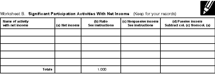 Worksheet A. Complete Worksheet A, Significant Participation Passive Activities (shown on the next page), if you have income or losses from any significant participation activity. Begin by entering the name of each activity in the left column. Column (a). Enter the number of hours you participated in each activity and total the column. If the total is more than 500, do not complete Worksheet A or B. None of the activities are passive activities because you satisfy test 4 for material participation. (See Material participation tests, earlier.) Report all the income and losses from these activities on the forms and schedules you normally use. Do not include the income and losses on Form 8582. Column (b). Enter the net loss, if any, from the activity. Net loss from an activity means either: