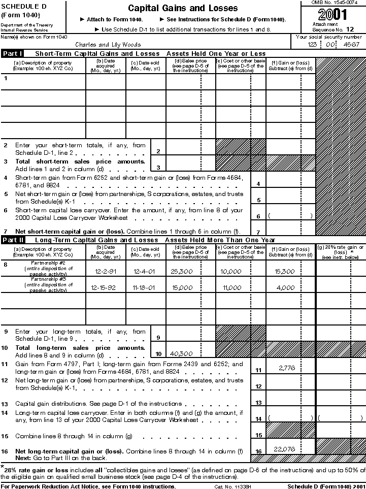 November 2001. They recognize a $4,000 ($15,000 selling price minus $11,000 adjusted basis) long-term capital gain, which they report on Schedule