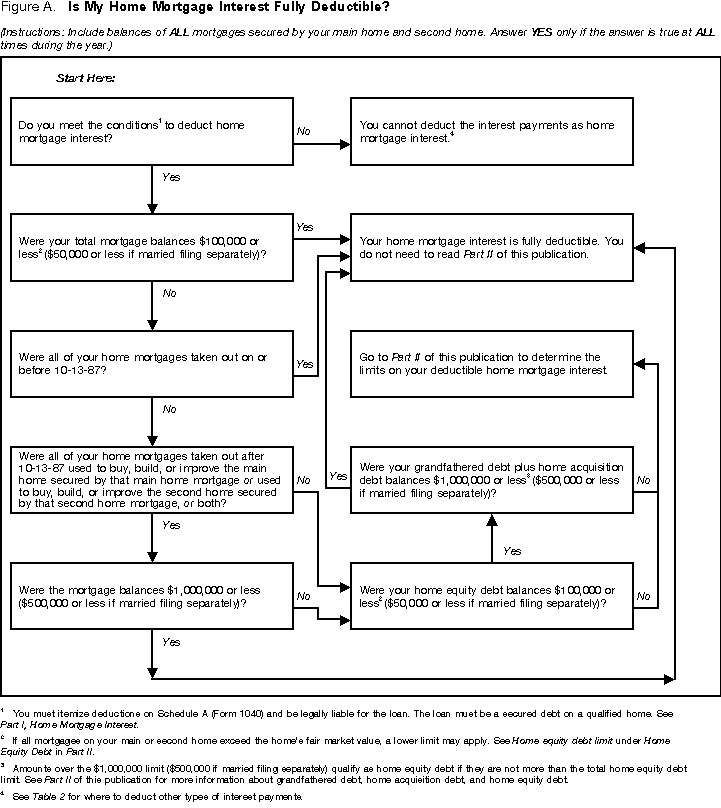 See Part II for more detailed definitions of grandfathered, home acquisition, and home equity debt. You can use Figure A to check whether your home mortgage interest is fully deductible. Figure A. Is My Home Mortgage Interest Fully Deductible? Secured DebtYou can deduct your home mortgage interest only if your mortgage is a secured debt. A secured debt is one in which you sign an instrument (such as a mortgage, deed of trust, or land contract) that:
