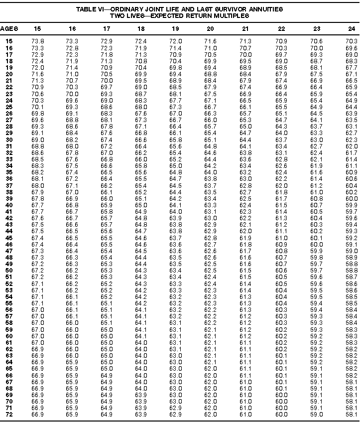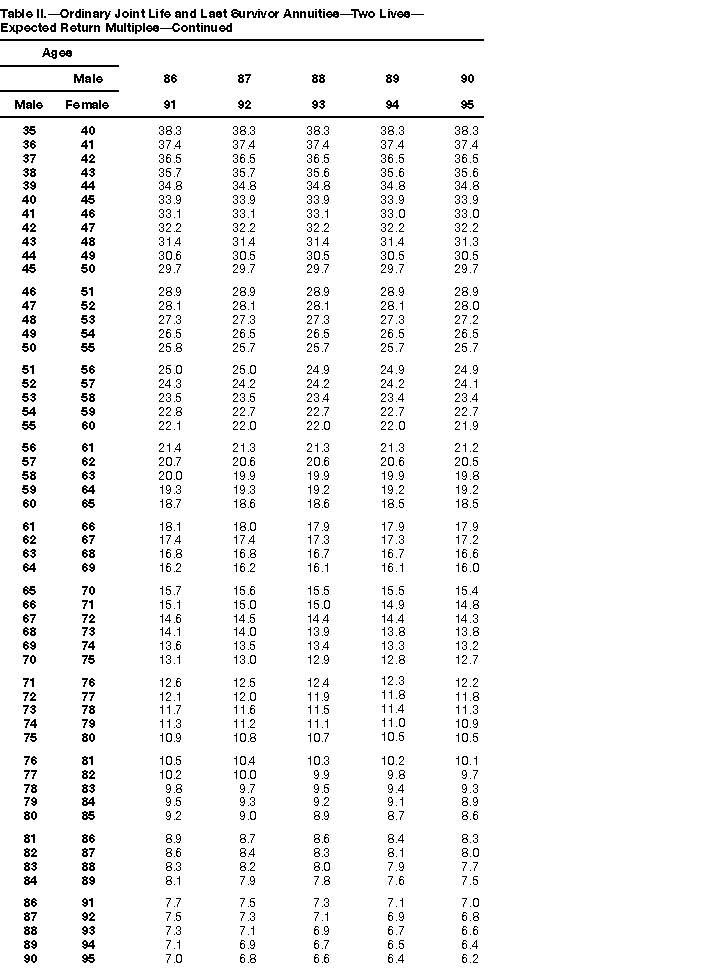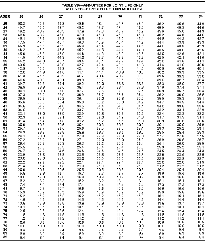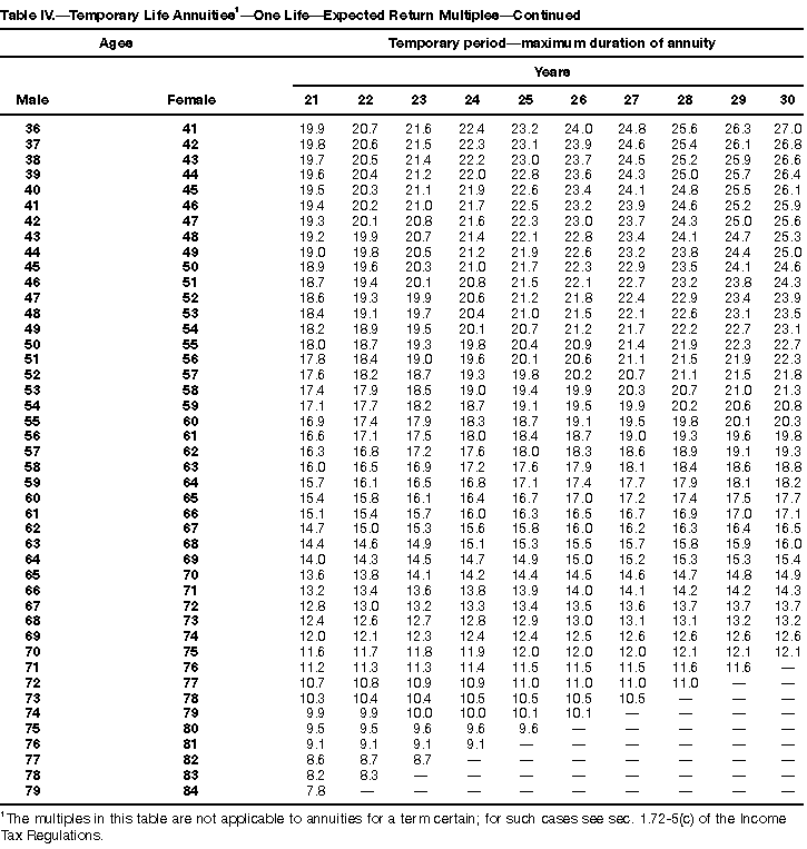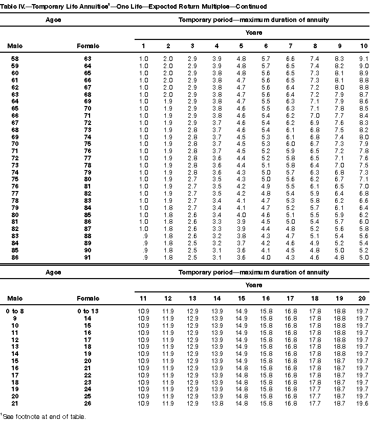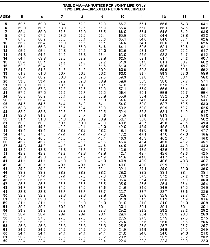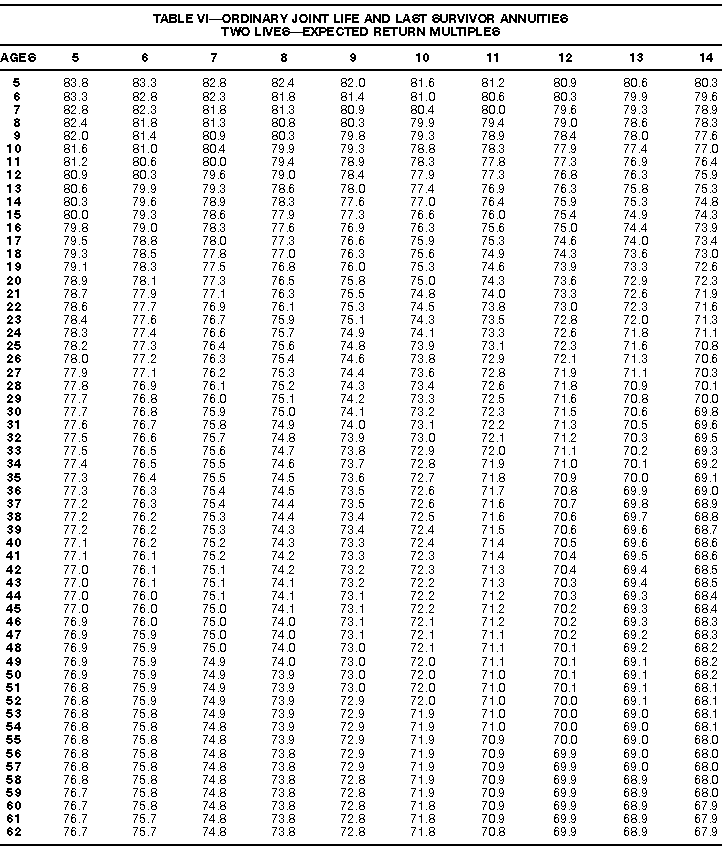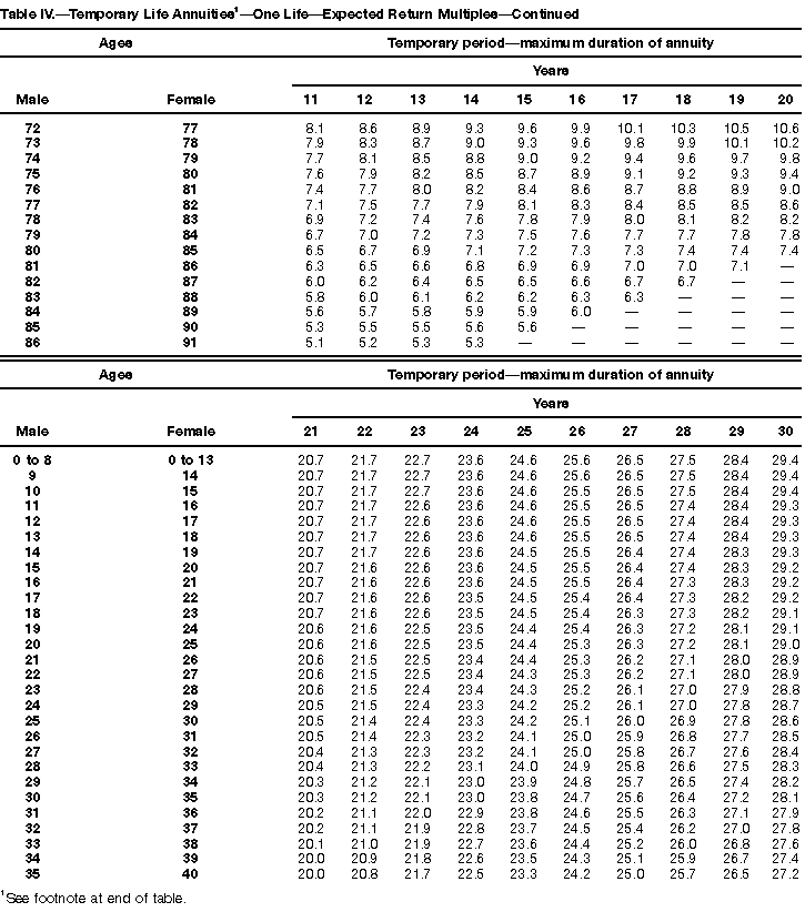 How To Use Actuarial TablesIn figuring, under the General Rule, the taxable part of your annuity payments that you are to get for the rest of your life (rather than for a fixed number of years), you must use one or more of the actuarial tables in this publication. Unisex Annuity TablesEffective July 1, 1986, the Internal Revenue Service adopted new annuity Tables V through VIII, in which your sex is not considered when determining the applicable factor. These tables correspond to the old Tables I through IV. In general, Tables V through VIII must be used if you made contributions to the retirement plan after June 30, 1986. If you made no contributions to the plan after June 30, 1986, generally you must use only Tables I through IV. However, if you received an annuity payment after June 30, 1986, you may elect to use Tables V through VIII (see Annuity received after June 30, 1986, later). Special ElectionsAlthough you generally must use Tables V through VIII if you made contributions to the retirement plan after June 30, 1986, and Tables I through IV if you made no contributions after June 30, 1986, you can make the following special elections to select which tables to use. Contributions made both before July 1986 and after June 1986. If you made contributions to the retirement plan both before July 1986 and after June 1986, you may elect to use Tables I through IV for the pre-July 1986 cost of the contract, and Tables V through VIII for the post-June 1986 cost. (See the examples below.) Making the election. Attach this statement to your income tax return for the first year in which you receive an annuity: "I elect to apply the provisions of paragraph (d) of section 1.72-6 of the Income Tax Regulations." The statement must also include your name, address, social security number, and the amount of the pre-July 1986 investment in the contract.