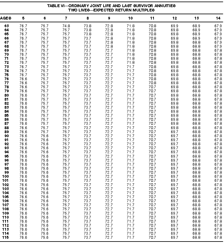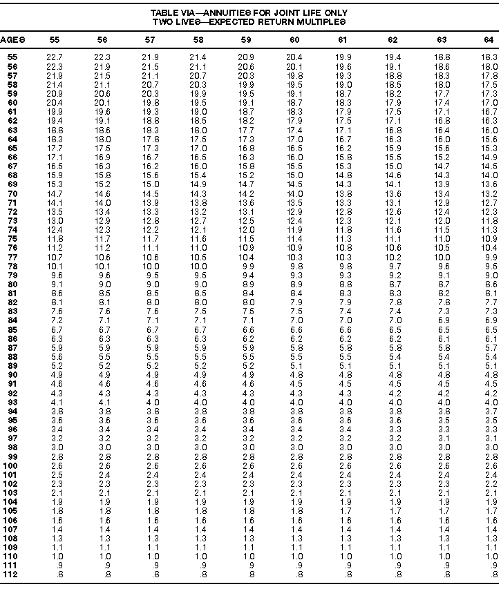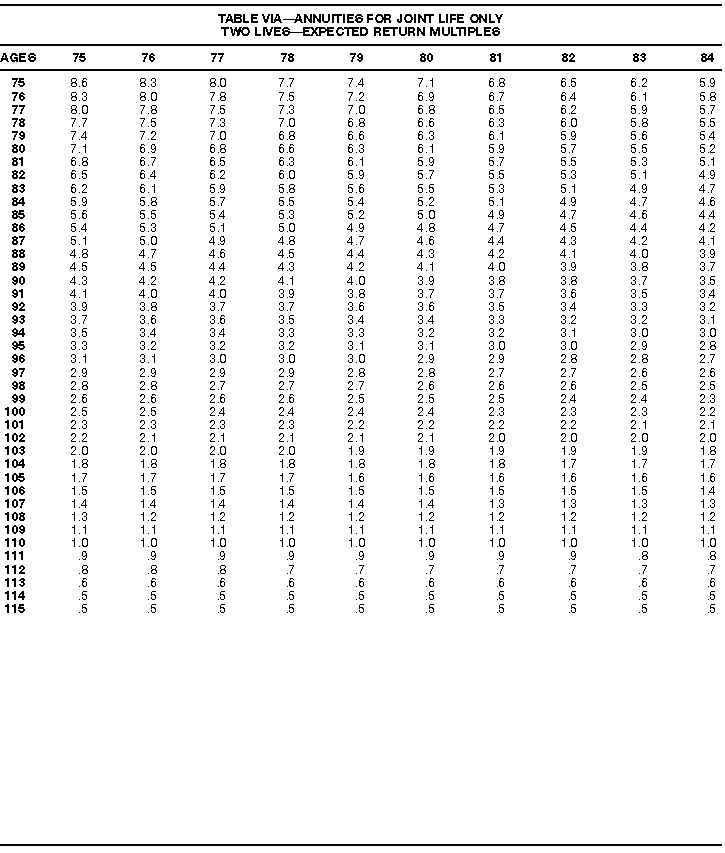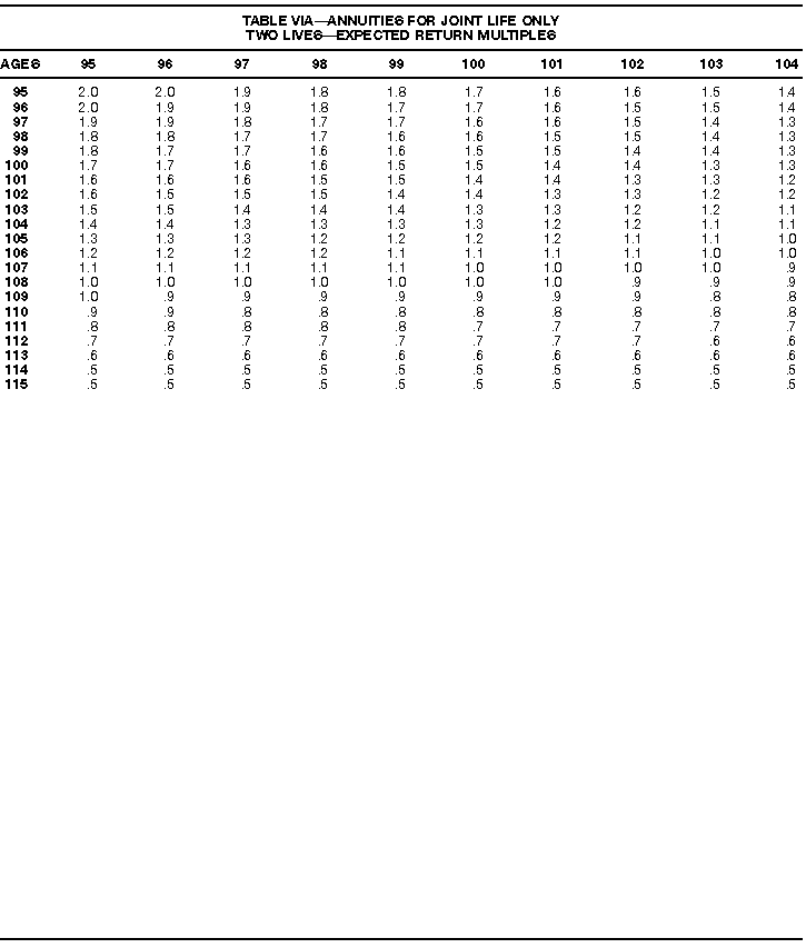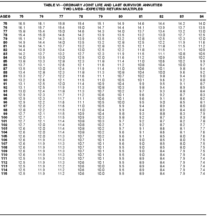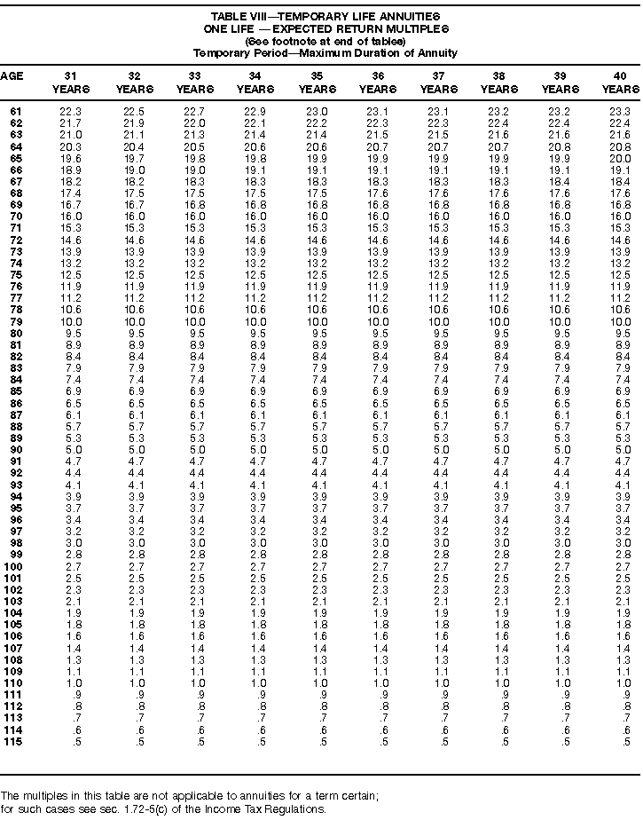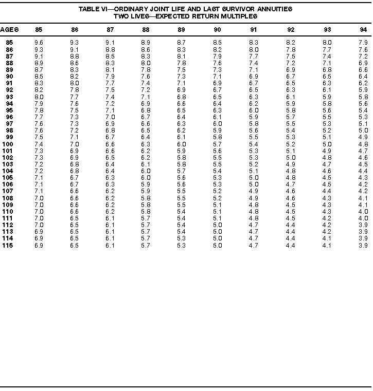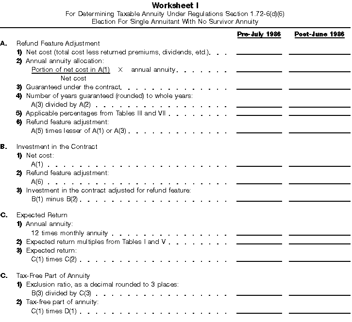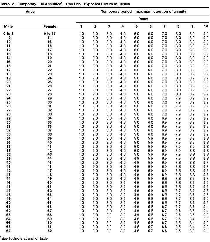 How To Use Actuarial TablesIn figuring, under the General Rule, the taxable part of your annuity payments that you are to get for the rest of your life (rather than for a fixed number of years), you must use one or more of the actuarial tables in this publication. Unisex Annuity TablesEffective July 1, 1986, the Internal Revenue Service adopted new annuity Tables V through VIII, in which your sex is not considered when determining the applicable factor. These tables correspond to the old Tables I through IV. In general, Tables V through VIII must be used if you made contributions to the retirement plan after June 30, 1986. If you made no contributions to the plan after June 30, 1986, generally you must use only Tables I through IV. However, if you received an annuity payment after June 30, 1986, you may elect to use Tables V through VIII (see Annuity received after June 30, 1986, later). Special ElectionsAlthough you generally must use Tables V through VIII if you made contributions to the retirement plan after June 30, 1986, and Tables I through IV if you made no contributions after June 30, 1986, you can make the following special elections to select which tables to use. Contributions made both before July 1986 and after June 1986. If you made contributions to the retirement plan both before July 1986 and after June 1986, you may elect to use Tables I through IV for the pre-July 1986 cost of the contract, and Tables V through VIII for the post-June 1986 cost. (See the examples below.) Making the election. Attach this statement to your income tax return for the first year in which you receive an annuity: "I elect to apply the provisions of paragraph (d) of section 1.72-6 of the Income Tax Regulations." The statement must also include your name, address, social security number, and the amount of the pre-July 1986 investment in the contract.