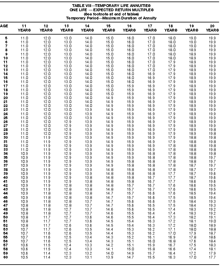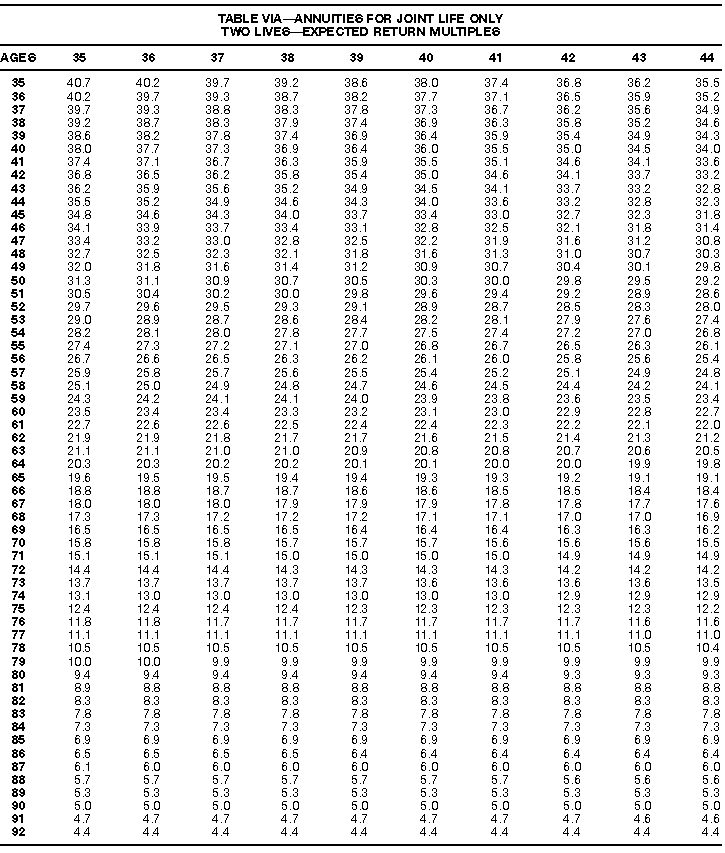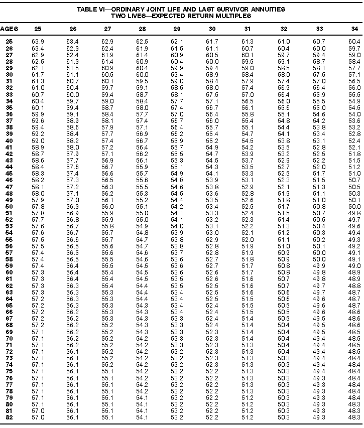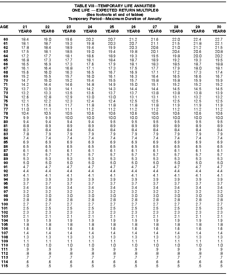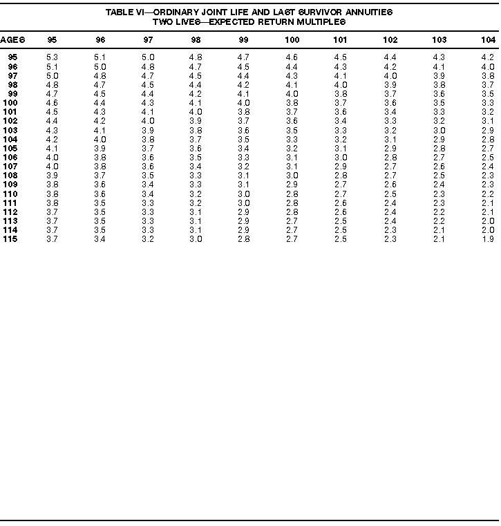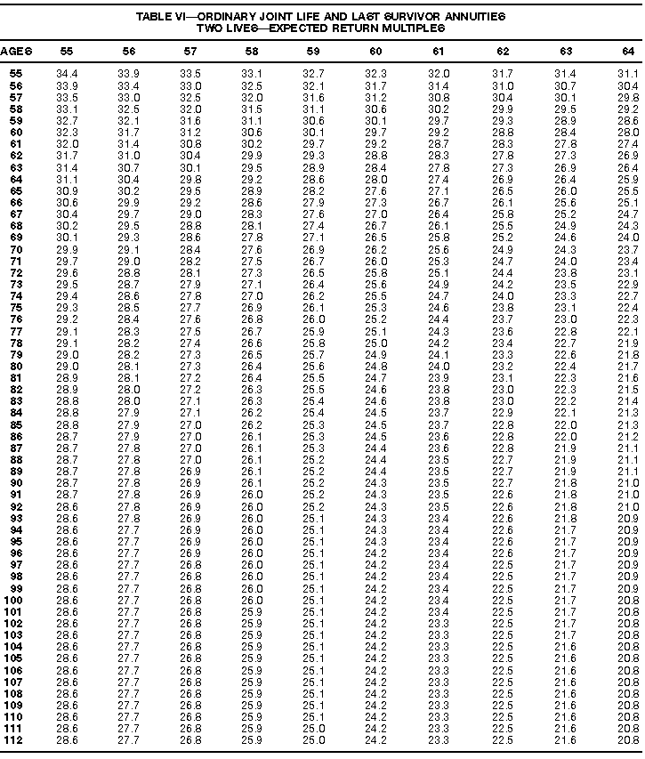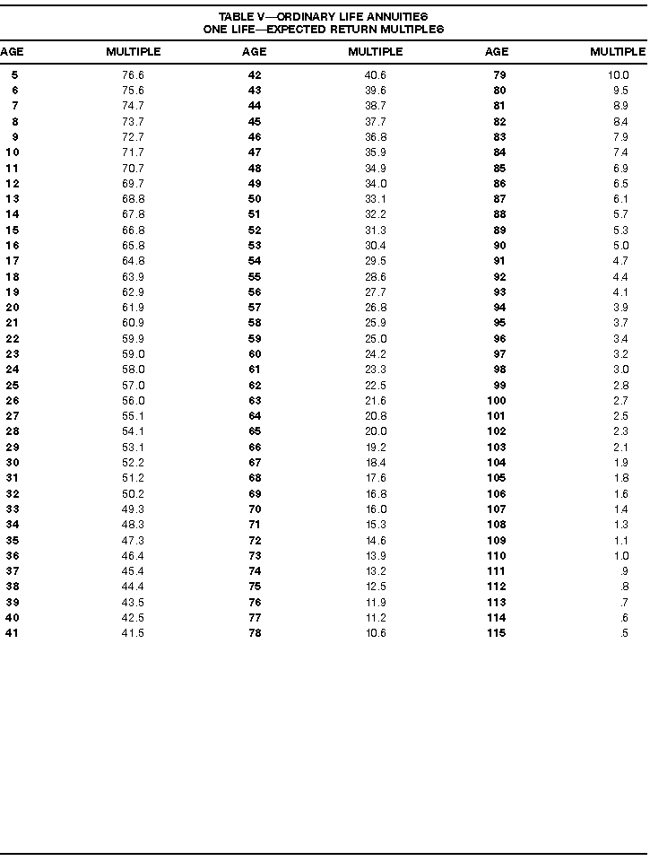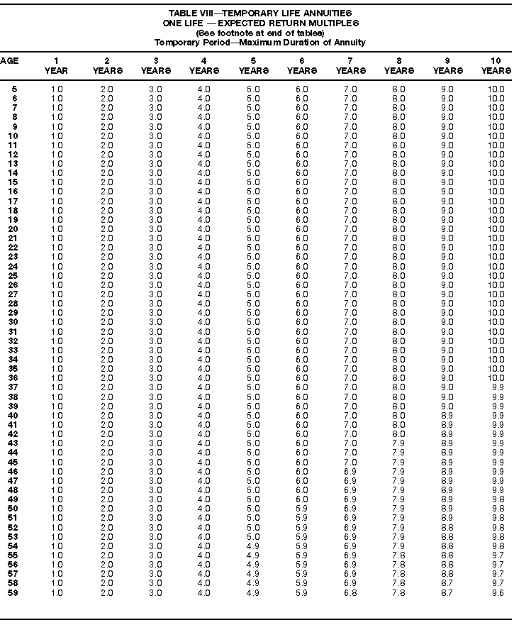 How To Use Actuarial TablesIn figuring, under the General Rule, the taxable part of your annuity payments that you are to get for the rest of your life (rather than for a fixed number of years), you must use one or more of the actuarial tables in this publication. Unisex Annuity TablesEffective July 1, 1986, the Internal Revenue Service adopted new annuity Tables V through VIII, in which your sex is not considered when determining the applicable factor. These tables correspond to the old Tables I through IV. In general, Tables V through VIII must be used if you made contributions to the retirement plan after June 30, 1986. If you made no contributions to the plan after June 30, 1986, generally you must use only Tables I through IV. However, if you received an annuity payment after June 30, 1986, you may elect to use Tables V through VIII (see Annuity received after June 30, 1986, later). Special ElectionsAlthough you generally must use Tables V through VIII if you made contributions to the retirement plan after June 30, 1986, and Tables I through IV if you made no contributions after June 30, 1986, you can make the following special elections to select which tables to use. Contributions made both before July 1986 and after June 1986. If you made contributions to the retirement plan both before July 1986 and after June 1986, you may elect to use Tables I through IV for the pre-July 1986 cost of the contract, and Tables V through VIII for the post-June 1986 cost. (See the examples below.) Making the election. Attach this statement to your income tax return for the first year in which you receive an annuity: "I elect to apply the provisions of paragraph (d) of section 1.72-6 of the Income Tax Regulations." The statement must also include your name, address, social security number, and the amount of the pre-July 1986 investment in the contract.