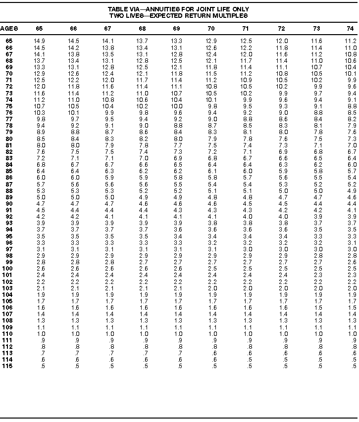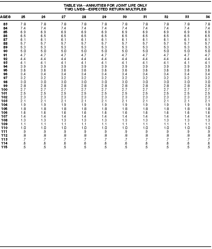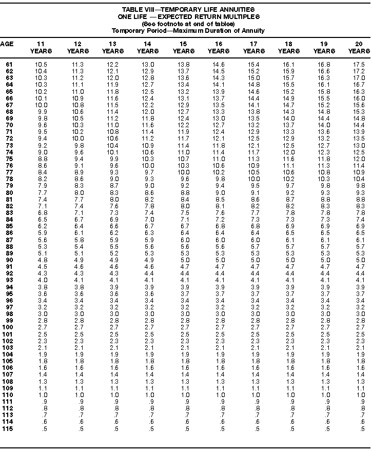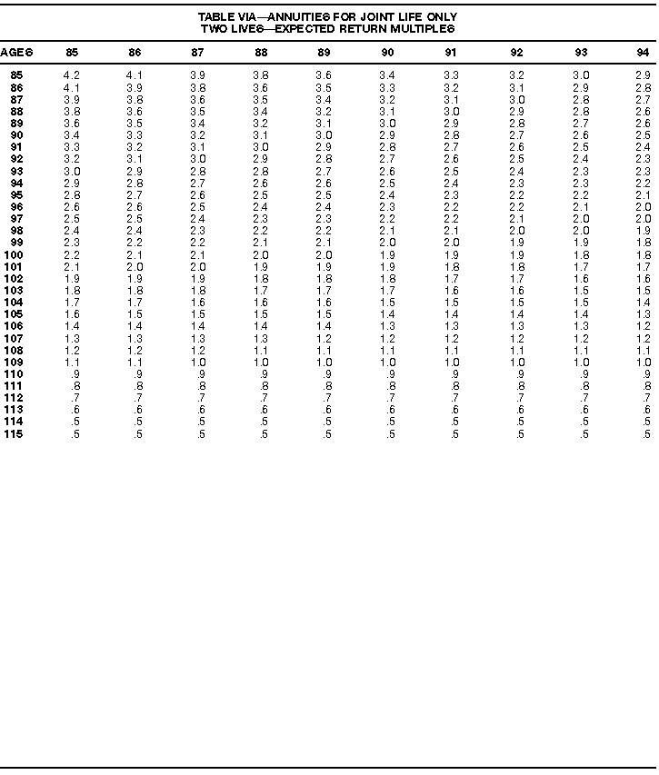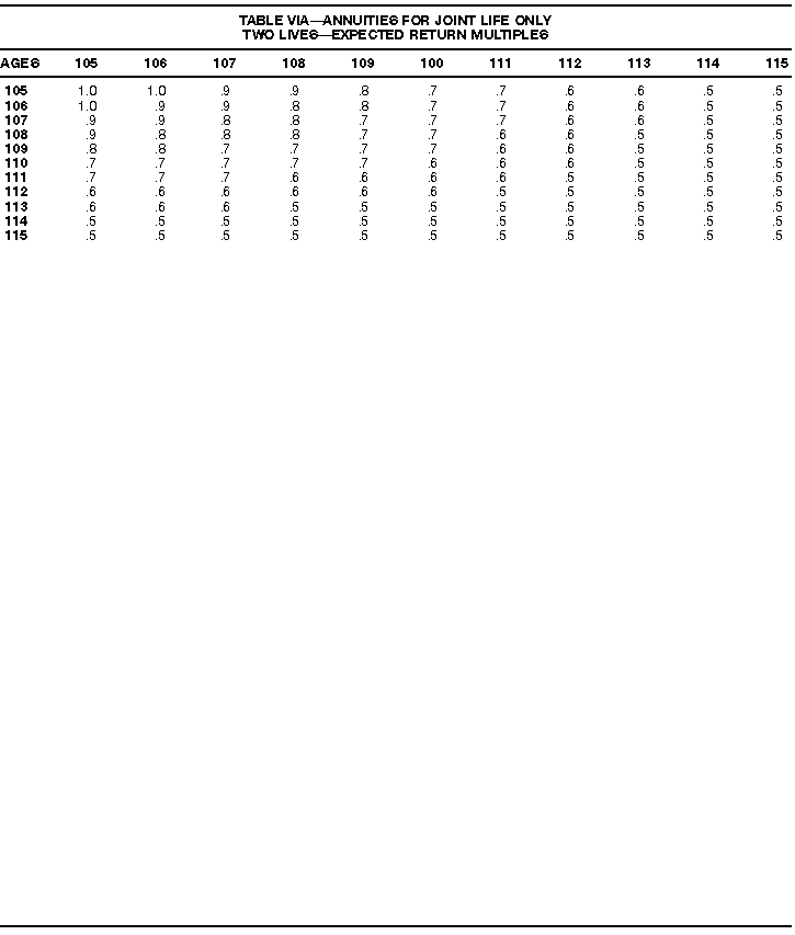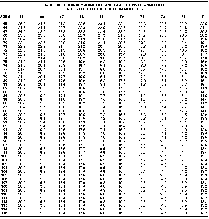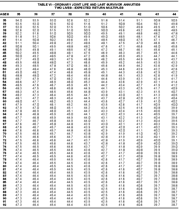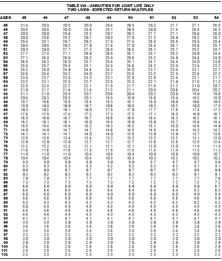 How To Use Actuarial TablesIn figuring, under the General Rule, the taxable part of your annuity payments that you are to get for the rest of your life (rather than for a fixed number of years), you must use one or more of the actuarial tables in this publication. Unisex Annuity TablesEffective July 1, 1986, the Internal Revenue Service adopted new annuity Tables V through VIII, in which your sex is not considered when determining the applicable factor. These tables correspond to the old Tables I through IV. In general, Tables V through VIII must be used if you made contributions to the retirement plan after June 30, 1986. If you made no contributions to the plan after June 30, 1986, generally you must use only Tables I through IV. However, if you received an annuity payment after June 30, 1986, you may elect to use Tables V through VIII (see Annuity received after June 30, 1986, later). Special ElectionsAlthough you generally must use Tables V through VIII if you made contributions to the retirement plan after June 30, 1986, and Tables I through IV if you made no contributions after June 30, 1986, you can make the following special elections to select which tables to use. Contributions made both before July 1986 and after June 1986. If you made contributions to the retirement plan both before July 1986 and after June 1986, you may elect to use Tables I through IV for the pre-July 1986 cost of the contract, and Tables V through VIII for the post-June 1986 cost. (See the examples below.) Making the election. Attach this statement to your income tax return for the first year in which you receive an annuity: "I elect to apply the provisions of paragraph (d) of section 1.72-6 of the Income Tax Regulations." The statement must also include your name, address, social security number, and the amount of the pre-July 1986 investment in the contract.