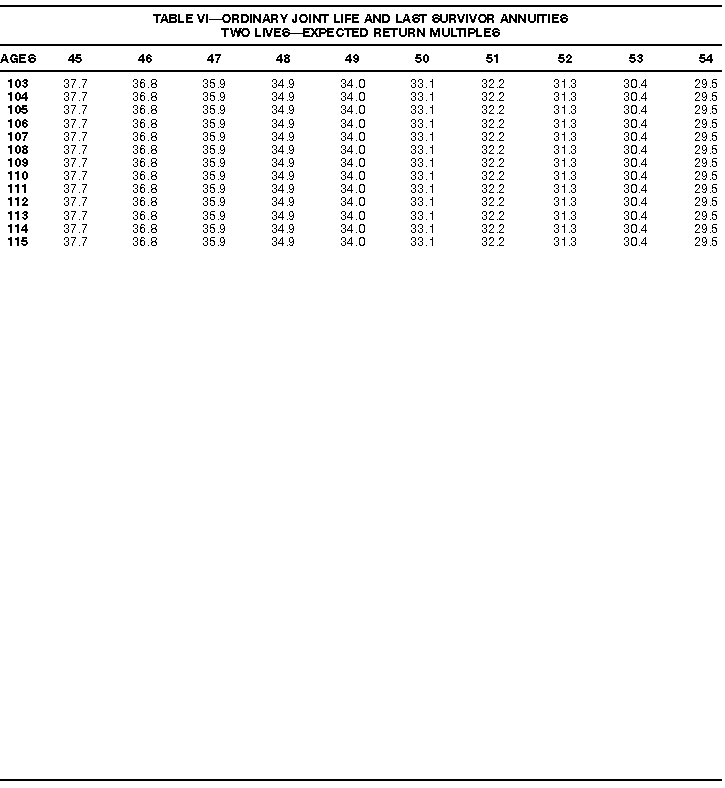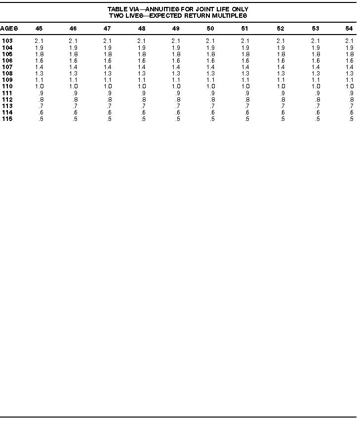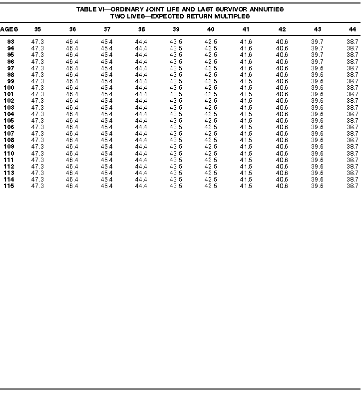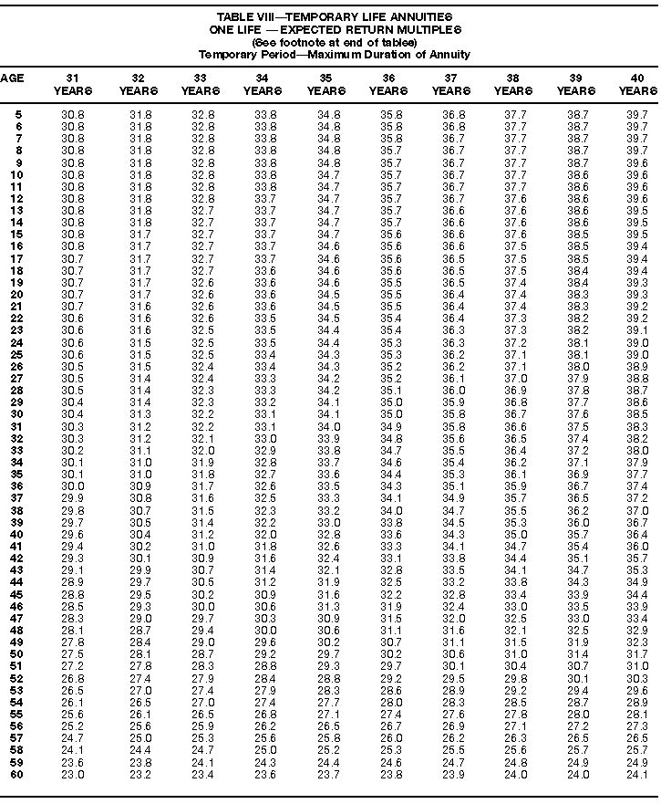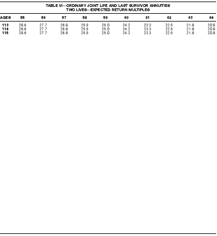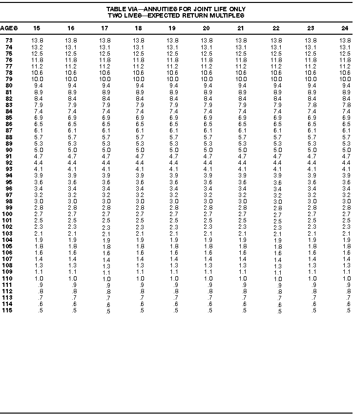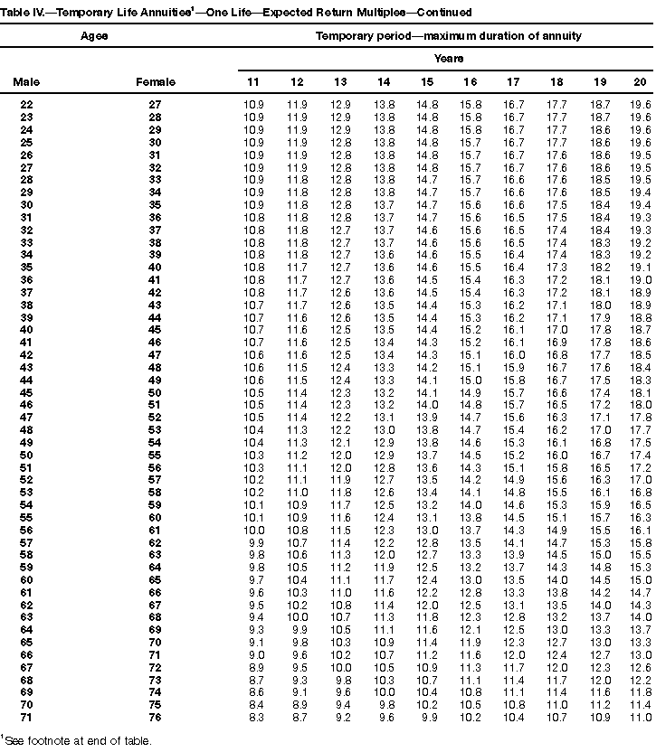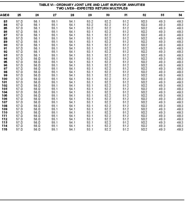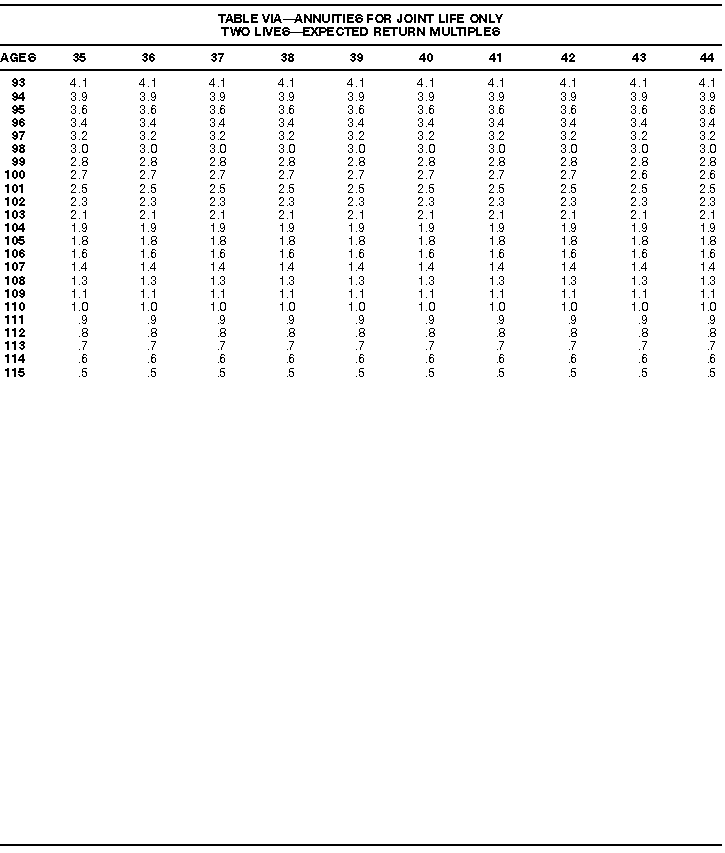 How To Use Actuarial TablesIn figuring, under the General Rule, the taxable part of your annuity payments that you are to get for the rest of your life (rather than for a fixed number of years), you must use one or more of the actuarial tables in this publication. Unisex Annuity TablesEffective July 1, 1986, the Internal Revenue Service adopted new annuity Tables V through VIII, in which your sex is not considered when determining the applicable factor. These tables correspond to the old Tables I through IV. In general, Tables V through VIII must be used if you made contributions to the retirement plan after June 30, 1986. If you made no contributions to the plan after June 30, 1986, generally you must use only Tables I through IV. However, if you received an annuity payment after June 30, 1986, you may elect to use Tables V through VIII (see Annuity received after June 30, 1986, later). Special ElectionsAlthough you generally must use Tables V through VIII if you made contributions to the retirement plan after June 30, 1986, and Tables I through IV if you made no contributions after June 30, 1986, you can make the following special elections to select which tables to use. Contributions made both before July 1986 and after June 1986. If you made contributions to the retirement plan both before July 1986 and after June 1986, you may elect to use Tables I through IV for the pre-July 1986 cost of the contract, and Tables V through VIII for the post-June 1986 cost. (See the examples below.) Making the election. Attach this statement to your income tax return for the first year in which you receive an annuity: "I elect to apply the provisions of paragraph (d) of section 1.72-6 of the Income Tax Regulations." The statement must also include your name, address, social security number, and the amount of the pre-July 1986 investment in the contract.