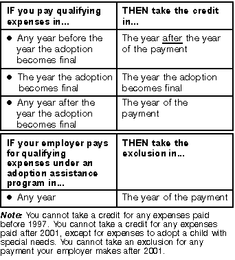 After 2001, the amount of your allowable adoption credit for a year cannot be more than your regular tax for that year reduced by your tentative minimum tax (determined without regard to the AMT foreign tax credit), minus the amounts listed in (2) through (6). When To Take the Credit or ExclusionWhen you can take the adoption credit or exclusion depends on whether the eligible child is a citizen or resident of the United States (including U.S. possessions) at the time the adoption effort begins. Child who is a U.S. citizen or resident. If the eligible child is a U.S. citizen or resident, you can take the adoption credit or exclusion even if the adoption never becomes final. Take the credit or exclusion as shown in the following tables.