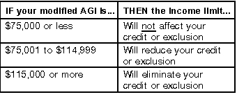 Your employer is not required to withhold income tax on payments for qualifying expenses under an adoption assistance program. If you must include any of the payments in your income, your withholding may not be enough to cover the tax on those payments. Therefore, you may need to give your employer a new Form W-4 to adjust your withholding, or make estimated tax payments, to avoid a penalty for underpayment of estimated tax. Dollar LimitThe amount of your adoption credit or exclusion is limited to $5,000 for each effort to adopt an eligible child or $6,000 for each effort to adopt an eligible child with special needs. If you can take both a credit and an exclusion, this dollar limit applies separately to each. If you and another person adopt a child and both claim the credit or exclusion, this dollar limit applies to your combined credit or exclusion amounts. The $5,000 (or $6,000) amount is the maximum amount of qualifying expenses taken into account over all taxable years. Therefore, it must be reduced by the amount of qualifying expenses taken into account in previous years for the same adoption effort. Example 1. You are adopting an eligible child who is not a child with special needs. Your qualifying adoption expenses for the credit, before you apply the dollar limit, are $1,000 for 2000 and $6,000 for 2001. The maximum amount of expenses you can take into account for the total adoption effort is $5,000. If you take the $1,000 into account for 2000, the maximum amount of expenses you can take into account for 2001 must be reduced by the expenses you took into account for 2000. Therefore, your maximum credit for 2001 is $4,000 ($5,000 - $1,000). Example 2. You adopt two brothers, Bobby and Sam, neither of whom is a child with special needs. Your qualifying adoption expenses for the credit, before you apply the dollar limit, are $7,500 for Bobby and $7,500 for Sam. Under the dollar limit, the maximum amount of expenses you can take into account for both adoptions is $10,000 ($5,000 for each child). Example 3. You pay $3,000 of qualifying adoption expenses in an effort to adopt an eligible child. However, the adoption is not successful. You then pay an additional $4,000 of qualifying adoption expenses for the successful adoption of a different eligible child. For the dollar limit on the credit, you must treat the $7,000 of expenses as paid in one adoption effort. The maximum amount of expenses you can take into account is $5,000 ($6,000 if the child is a child with special needs). Income LimitThe income limit on the adoption credit or exclusion is based on modified adjusted gross income (modified AGI). Use the following table to see if the income limit will affect your credit or exclusion. Example 1. You are adopting an eligible child who is not a child with special needs. You take into account, after applying the dollar limit, $1,000 of qualifying expenses for 2000 and $4,000 for 2001. Your modified AGI for 2000 is $85,000, and your modified AGI for 2001 is $95,000. Under the income limit, your credit for both years is reduced ratably. You use Form 8839 to find the amount of the reduction. Your 2000 credit is reduced by 25%, to $750. Your 2001 credit is reduced by 50%, to $2,000. You cannot take any further credit for this adoption effort. Example 2. The facts are the same as in Example 1, except that your modified AGI for both years is $115,000. You cannot take any credit for the adoption expenses. Modified AGI. To figure your modified AGI for the purpose of the credit and exclusion, add back the following items to your adjusted gross income.