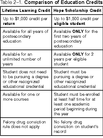 IntroductionThe lifetime learning credit may be available to you if you pay higher education costs. Table 2-1 summarizes the differences between the lifetime learning and Hope credits. If you are eligible to claim both credits based on the higher education expenses of one student, it will generally be to your benefit to claim the Hope credit. The Hope credit is discussed in chapter 1. This chapter explains: