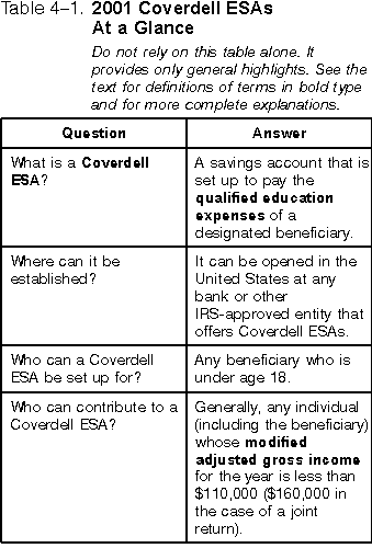 Beginning in 2002, you can also use withdrawals from a Coverdell ESA account for certain elementary and secondary education expenses. For an explanation of elementary and secondary education expenses for which a withdrawal from a Coverdell ESA can be used, see Publication 553. Designated beneficiary. The individual named in the document creating the trust or custodial account to receive the benefit of the funds in the account is the designated beneficiary. Eligible educational institution. An eligible educational institution is any college, university, vocational school, or other postsecondary educational institution eligible to participate in a student aid program administered by the Department of Education. It includes virtually all accredited, public, nonprofit, and proprietary (privately owned profit-making) postsecondary institutions. The educational institution should be able to tell you if it is an eligible educational institution. Half-time student. A student is enrolled "at least half-time" if he or she is enrolled for at least half the full-time academic work load for the course of study the student is pursuing as determined under the standards of the school where the student is enrolled. |