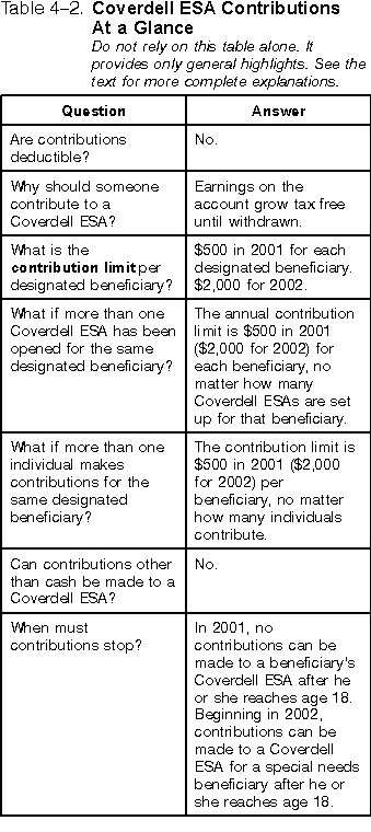Limit for each designated beneficiary. The total of all contributions to all Coverdell ESAs set up for the benefit of any one designated beneficiary cannot be more than $500 in 2001 ($2,000 for 2002). This includes contributions (other than rollovers) to all the beneficiary's Coverdell ESAs from all sources. Rollovers are discussed under Rollovers and Other Transfers, later. Limit for each contributor. You can contribute up to $500 for each designated beneficiary for 2001 ($2,000 for 2002). This is the most you can contribute for the benefit of any one beneficiary for the year, regardless of the number of Coverdell ESAs set up for the beneficiary. However, this limit may be reduced as explained below.