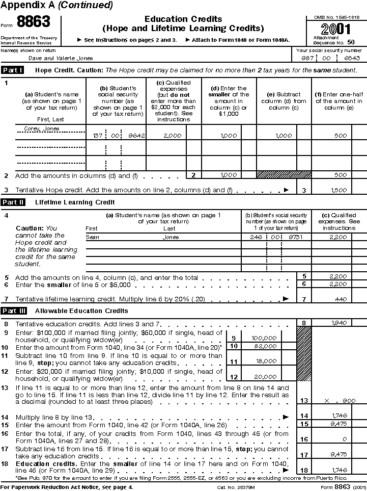 Appendix A. Illustrated Example of Education CreditsDave and Valerie are married and file a joint tax return. For 2001, they claim exemptions for their two dependent children on their tax return. Their modified adjusted gross income is $82,000. Their tax is $9,475. Their son, Sean, will receive his bachelor's degree in psychology from the state college in May 2002. Their daughter, Corey, enrolled full-time at that same college in August 2000 to begin working on her bachelor's degree in physical education. In July 2001, Dave and Valerie paid $2,200 in tuition costs for each child for the fall 2001 semester. Dave and Valerie, their children, and the college meet all of the requirements for the higher education credits. Because Sean is beyond the second (sophomore) year of his postsecondary education, his expenses do not qualify for the Hope credit. But, amounts paid for Sean's expenses in 2001 for academic periods beginning in 2001 qualify for the lifetime learning credit. Corey is in her first two (freshman and sophomore) years of postsecondary education and expenses paid for her in 2001 for academic periods beginning in 2001 qualify for the Hope credit. Dave and Valerie figure their tentative education credits for 2001, $1,940, as shown in the completed Form 8863. They cannot claim the full amount because their modified adjusted gross income is more than $80,000. They carry the amount from line 18 of Form 8863 to line 46 of Form 1040, and they attach the Form 8863 to their return. |