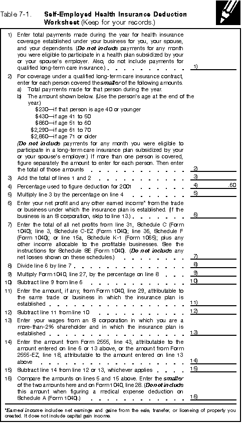 | | Table 7–1. Self-Employed Health Insurance Deduction Worksheet